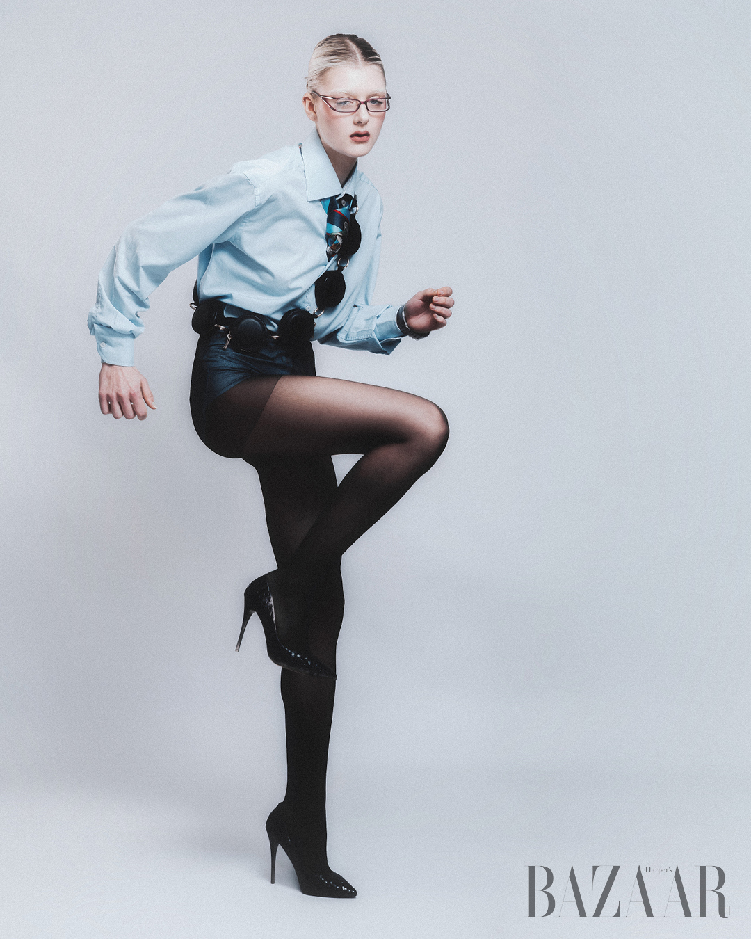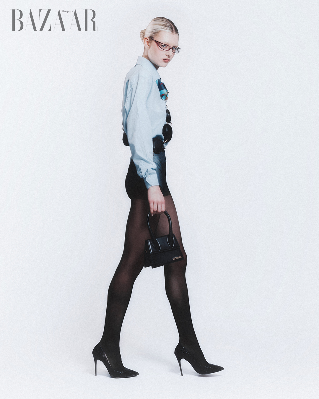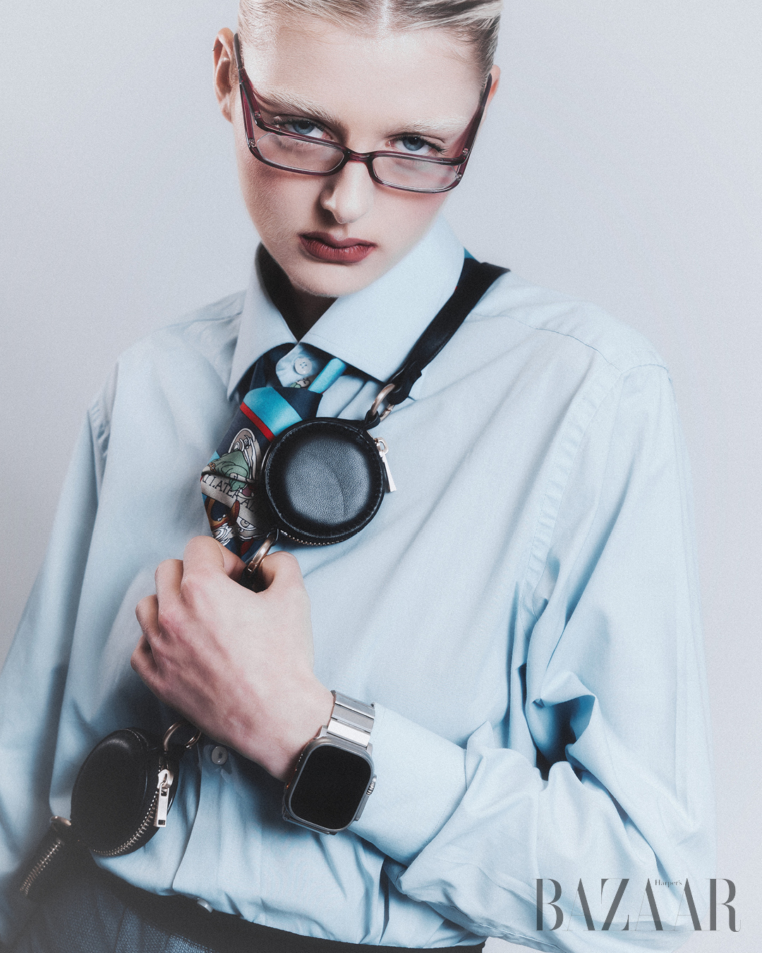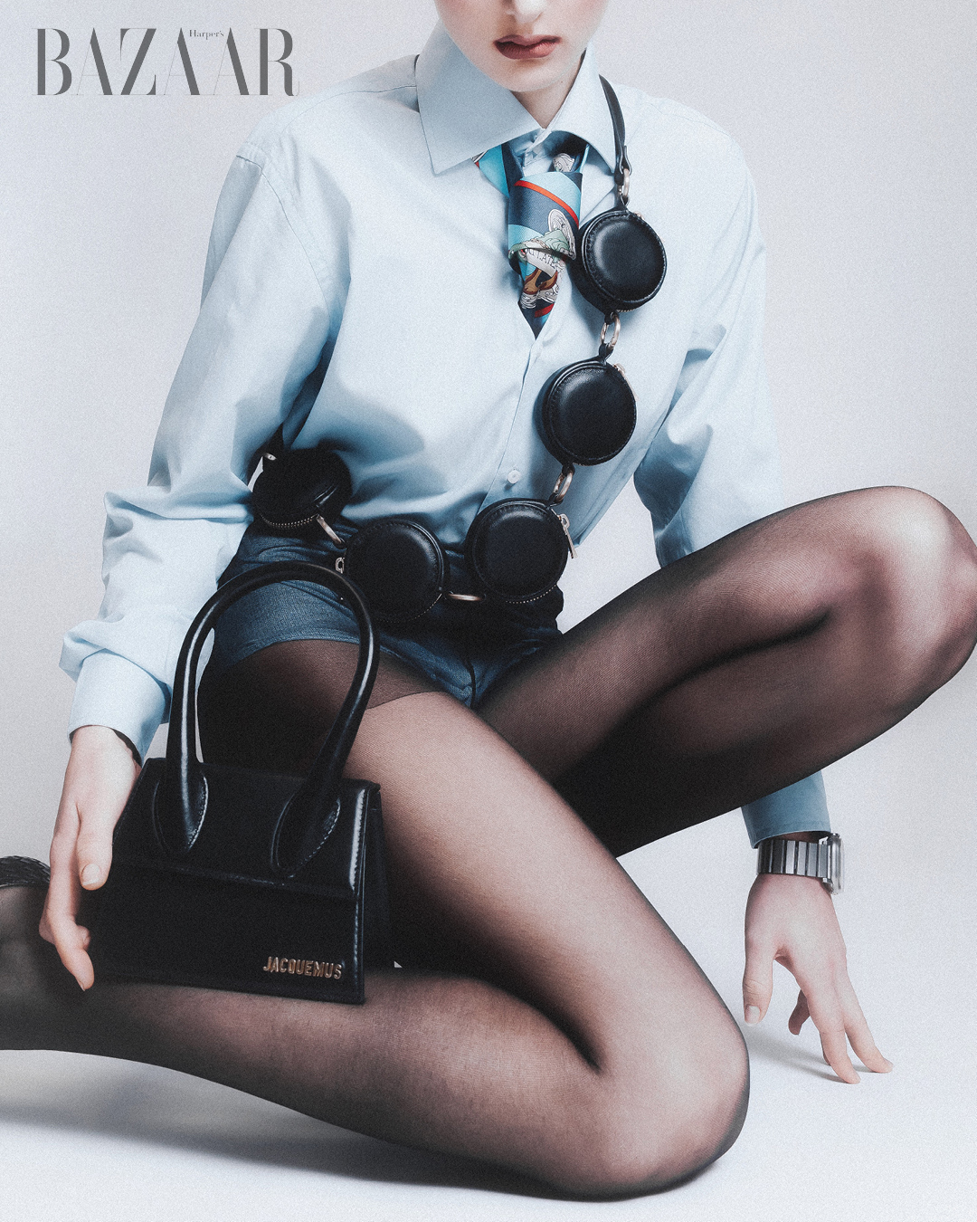 Áo sơ mi: Enrico Coveri. Cà vạt: Iceberg. Túi choàng qua người: Stefano Pilati x Zara. Túi xách tay: Jacquemus. Đồng hồ Apple Watch Ultra 3.