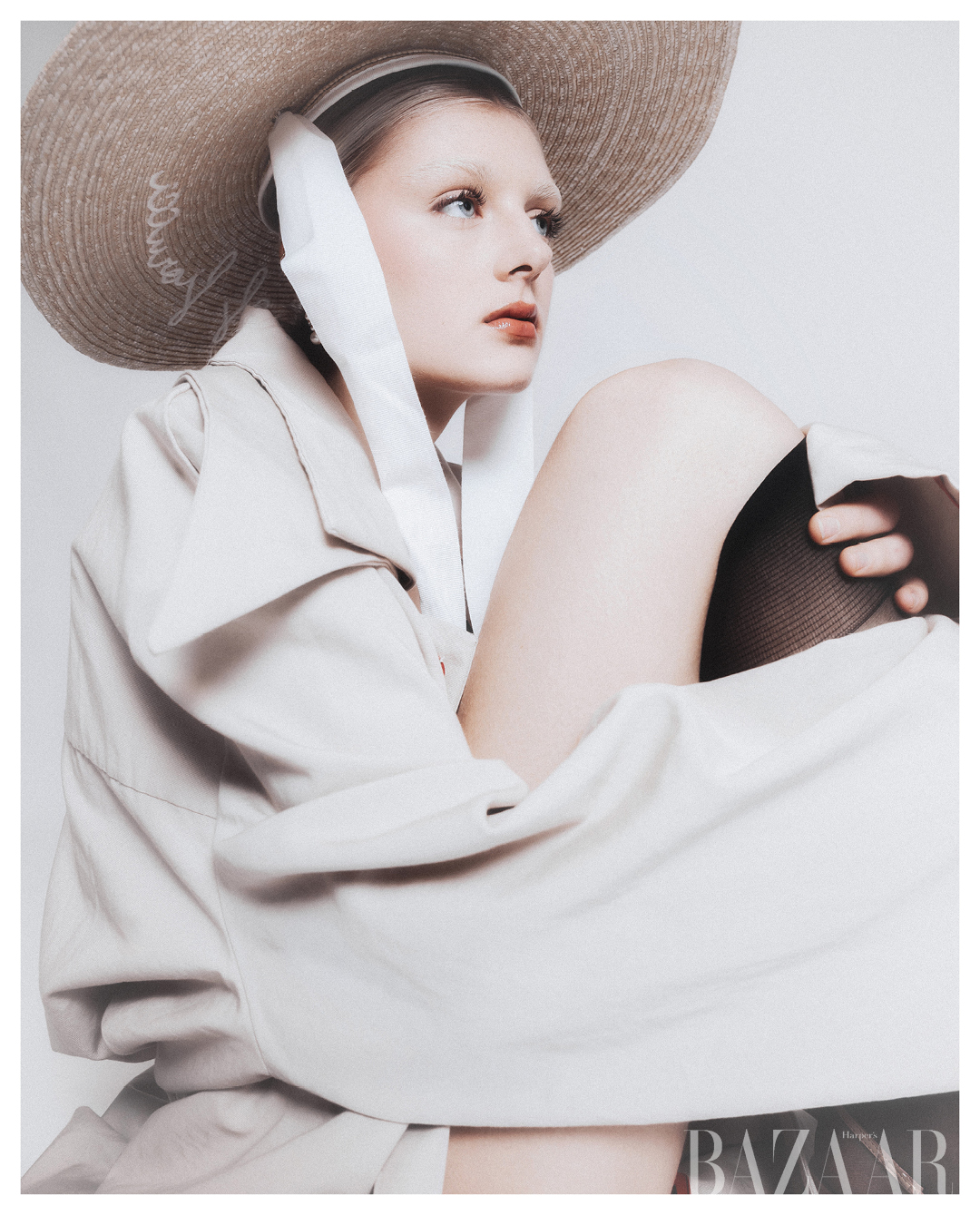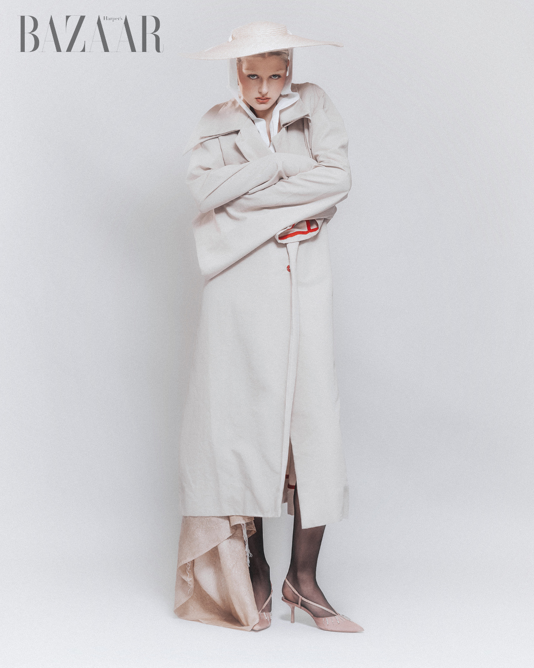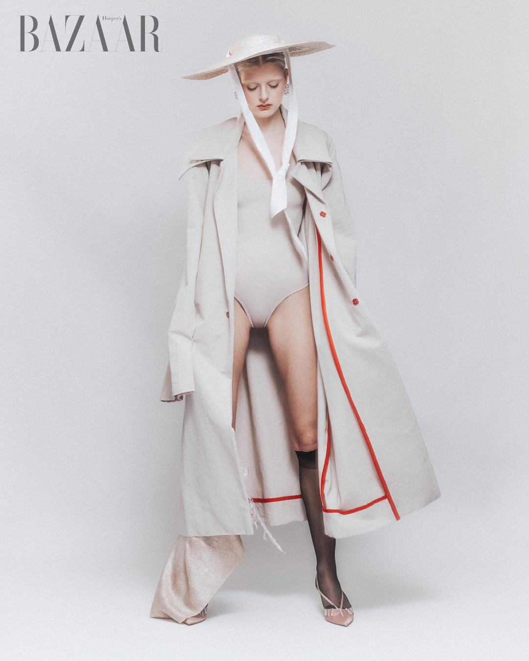Áo choàng trench coat (designer): Paolo Rizzi. Nón: Fiorucci. Bộ đồ bodysuit: Intimissimi. Giày: Zara.