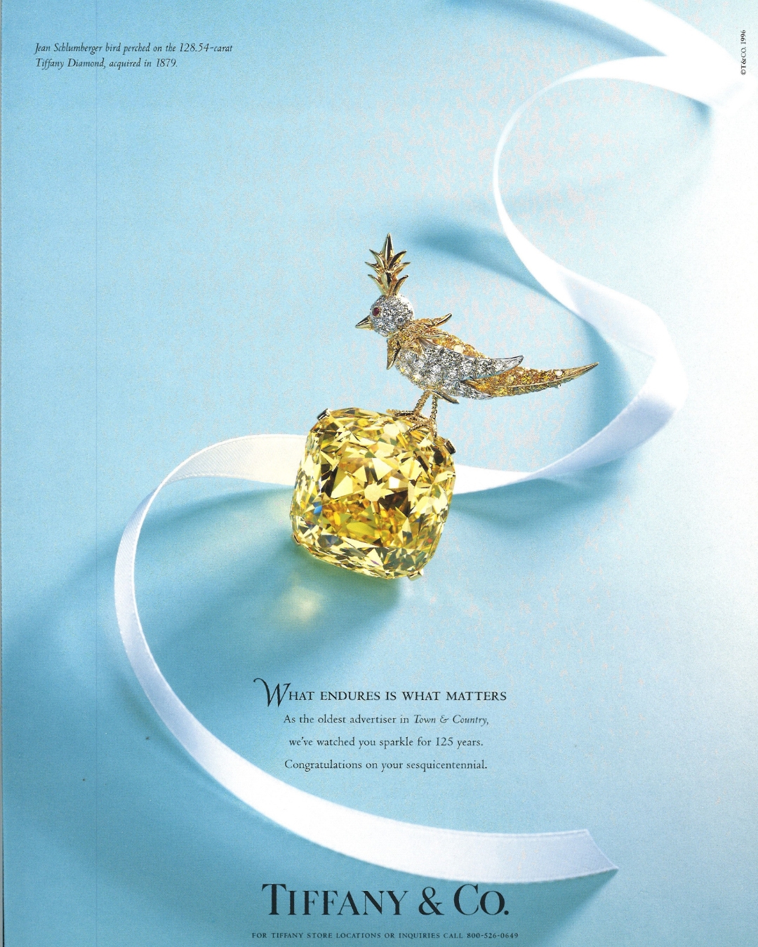 Kim cương Tiffany được phát hiện vào năm 1877 dưới dạng viên đá thô nặng 287,42 carat từ mỏ kim cương Kimberley. Sau đó, viên đá được cắt thành dạng cushion brilliant với 82 giác cắt, nặng 128,54 carat. Viên kim cương vàng này chỉ từng được công chúng chiêm ngưỡng qua 4 lần đeo chính thức. Thiết kế mới nhất này tri ân Jean Schlumberger, có thể sử dụng như mặt dây chuyền lẫn trâm cài áo. Tác phẩm được chế tác với hơn 75 carat kim cương và 10 viên sapphire hồng.