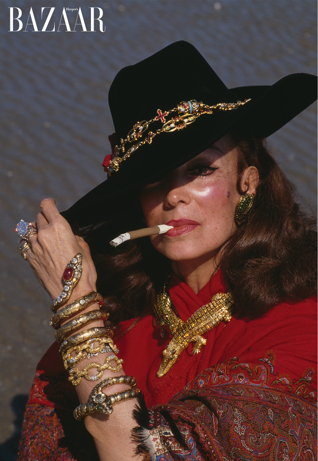 María Félix được nhiếp ảnh gia Lord Snowdon chụp tại Deauville vào năm 1980. Bà đeo chiếc vòng cổ “Crocodile” do Cartier chế tác theo đơn đặt hàng vào năm 1975, cùng đôi khuyên tai “Leaf” được tạo tác từ năm 1967. Ảnh: Cartier