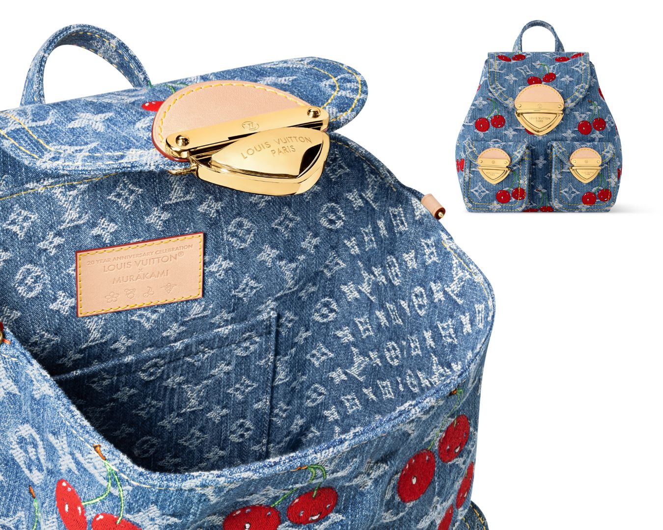 Với chiếc ba lô Venice NM Louis Vuitton x Murakami, chất liệu denim vốn đã gắn với cảm giác cá tính, được điểm thêm những hoạ tiết thêu hình hoa anh đào chín mọng nhân hóa theo hệ thẩm mỹ đặc trưng của Takashi Murakami, mang sắc đỏ tươi đầy sức sống cho bản phối giản đơn.