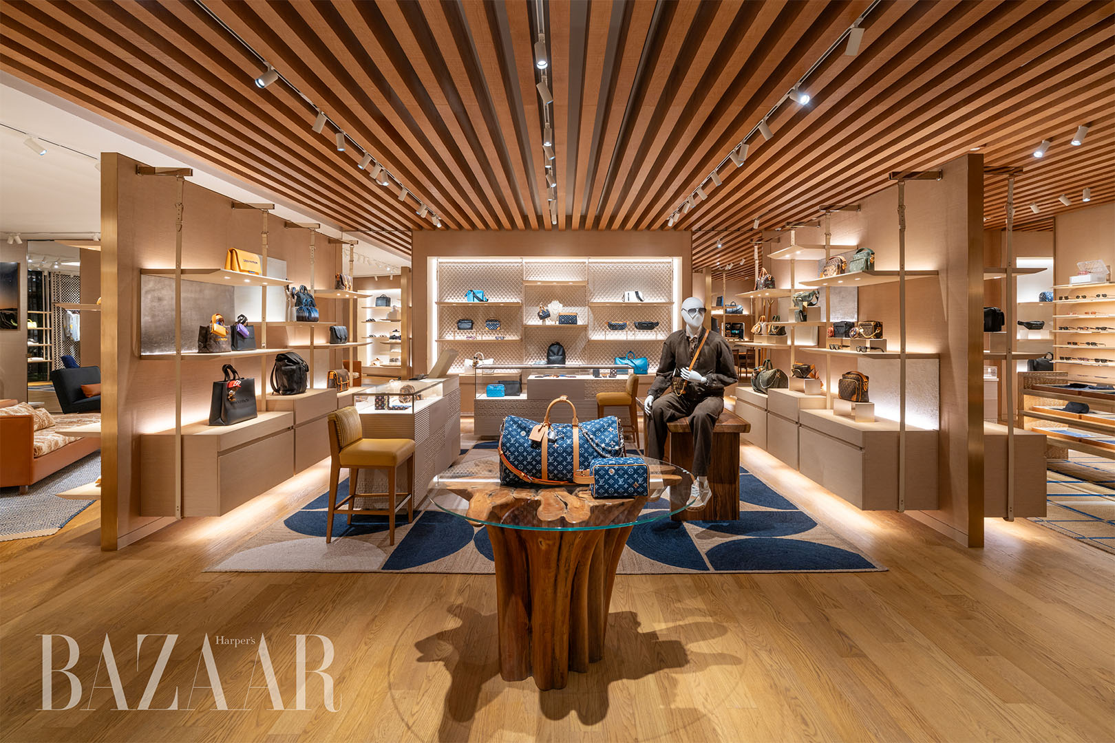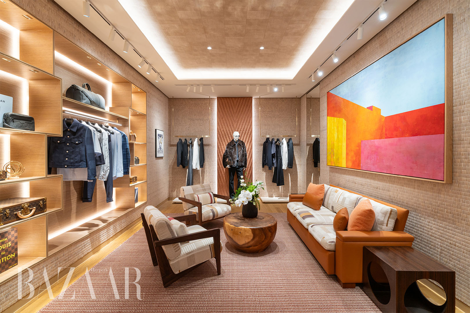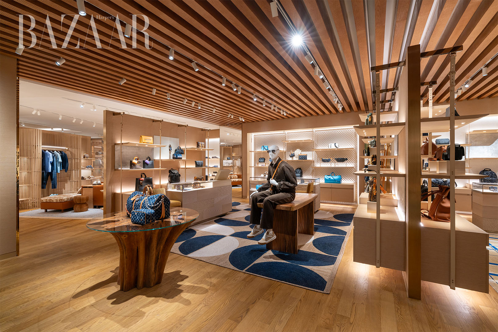 Lấy cảm hứng từ “Nghệ thuật Du hành” (Art of Travel) đặc trưng của Louis Vuitton, cửa hàng thời trang nam mới là sự tôn vinh dành cho một điểm đến giàu bản sắc văn hóa và kỹ nghệ thủ công lâu đời. Thiết kế nội thất là sự tương tác tinh tế giữa các chất liệu truyền thống và cao cấp, khéo léo lồng ghép các yếu tố như mây tre tinh xảo.