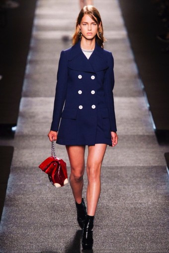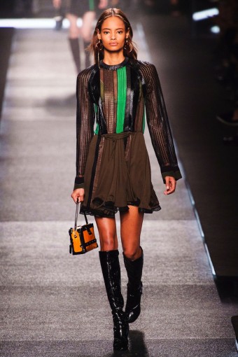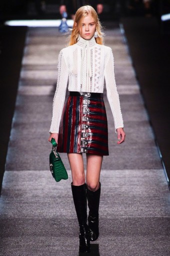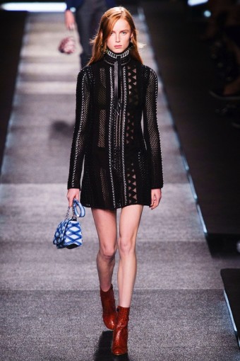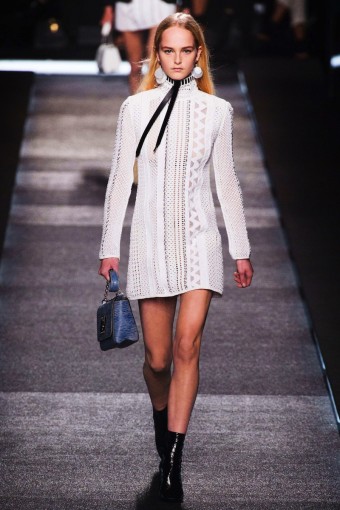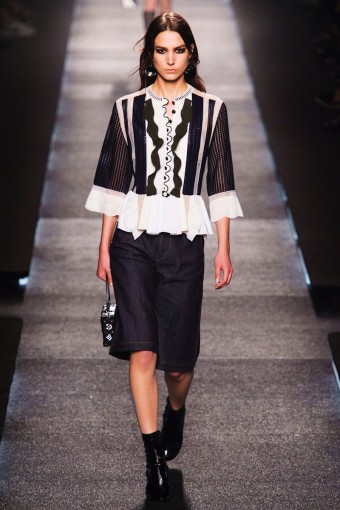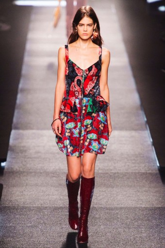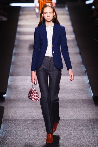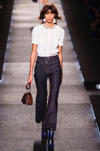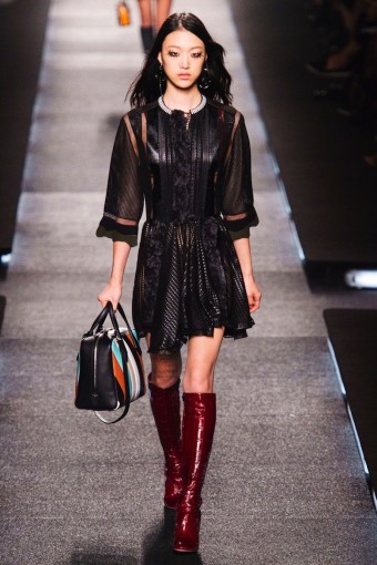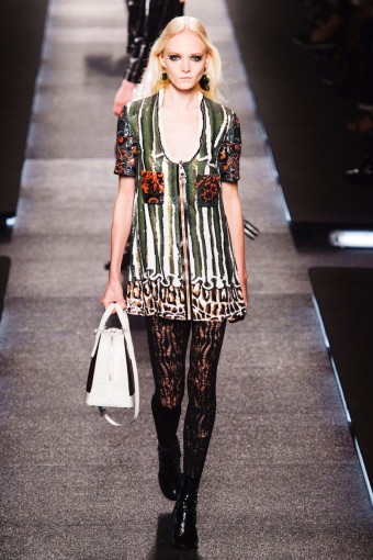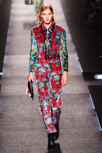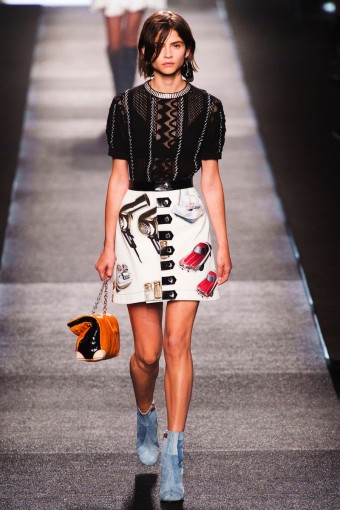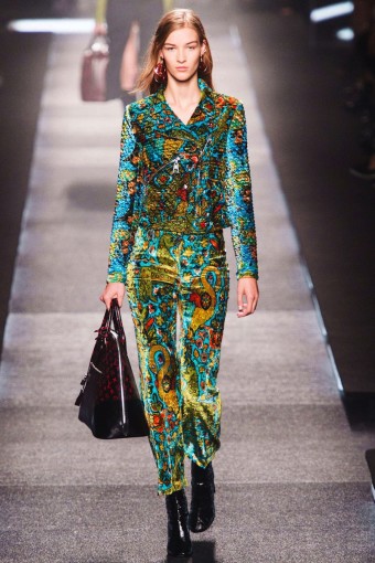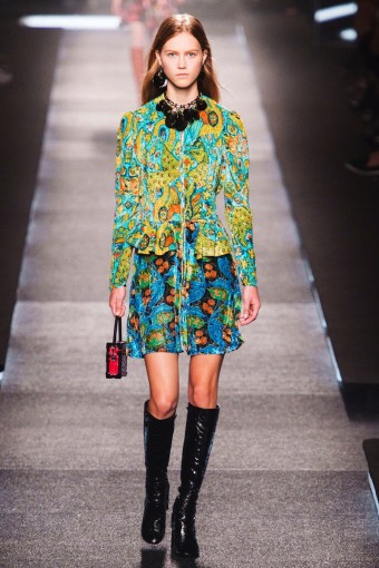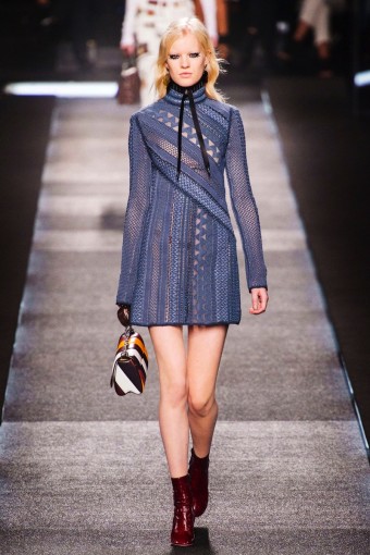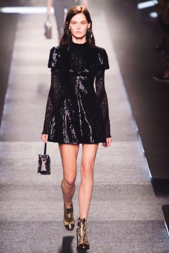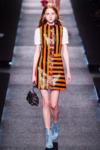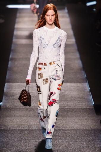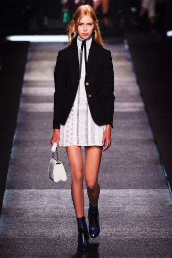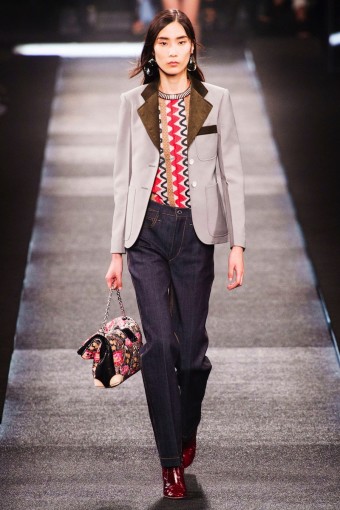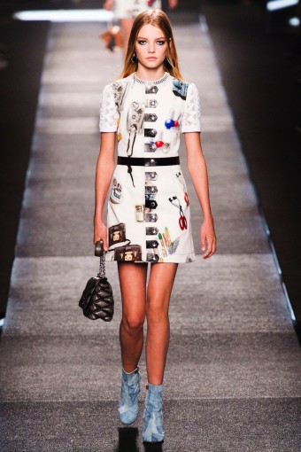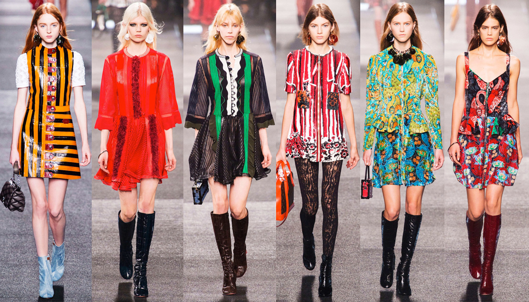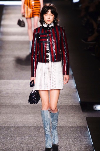 Bộ sưu tập lần này tiếp tục mang cảm hứng thập niên 1970 từ mùa Resort 2015. Bởi thế, phom váy chữ A cổ điển và quần ống loe là những kiểu dáng chiếm lĩnh. Điểm nhấn màu sắc đầu tiên là những chiếc váy, áo và đầm bằng da bóng kẻ sọc to màu xanh navy- đỏ hay đen-cam. Họa tiết đáng chú ý thứ hai là những bộ đầm, quần tây và chân váy in hình vật dụng trong nhà như hộp diêm, máy sấy tóc, điện thoại, dụng cụ bấm mi, xe hơi đồ chơi và cả chiếc túi Petite-Malle – phụ kiện hit của mùa Thu Đông 2014. Sắc màu nổi bật tiếp theo là combo áo khoác biker đi cùng quần đồng bộ bằng nhung sặc sỡ hoa văn thảm thêu. Nhu mì hơn, chúng ta có những chiếc đầm trắng hay đen bằng len đan móc hoa văn lưới và zigzag tạo hiệu ứng xuyên thấu như ren.