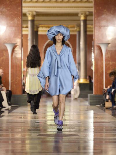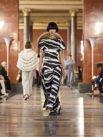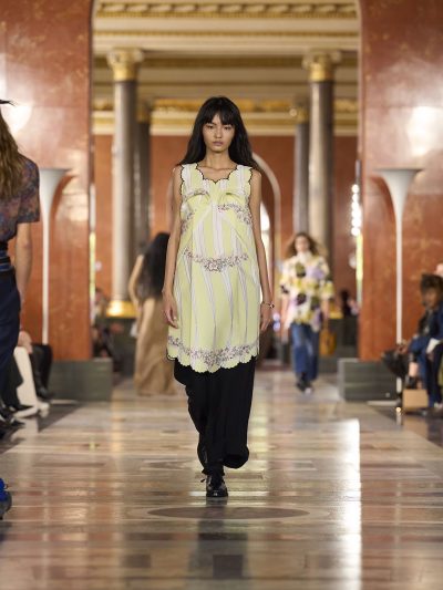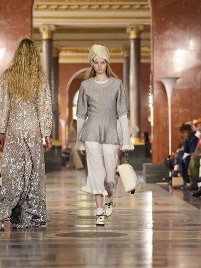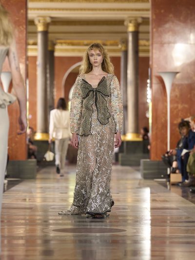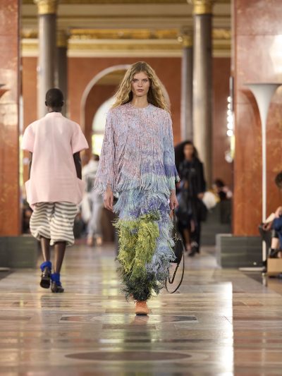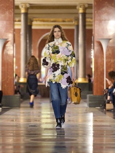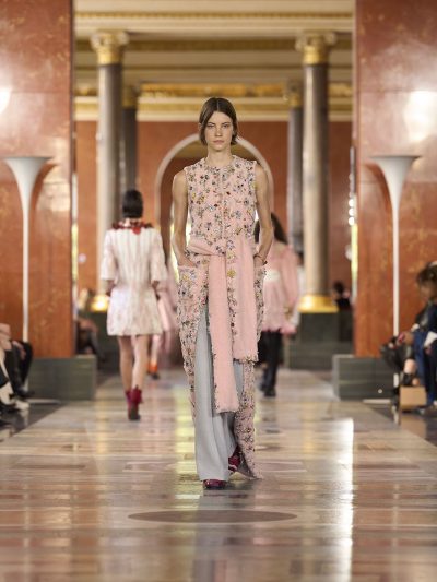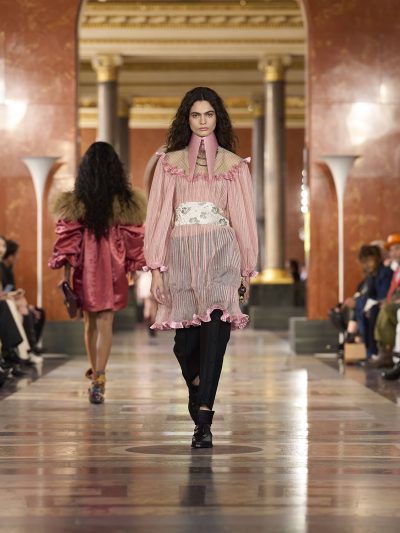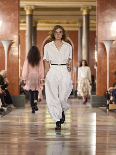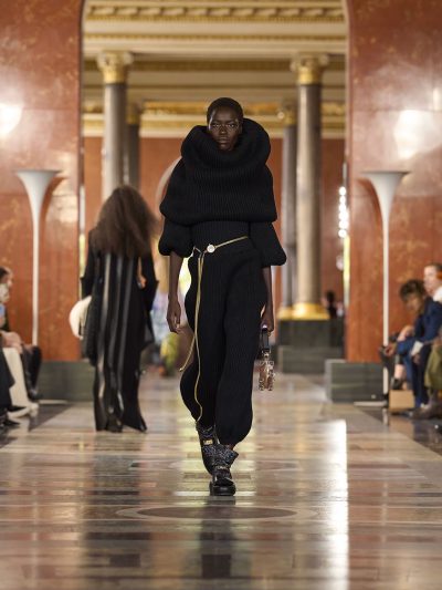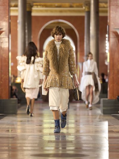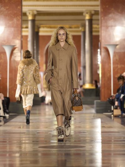 Và mặc dù một lần nữa đặt bối cảnh diễn show trong Louvre, nhưng Louis Vuitton vẫn còn rất nhiều cách khai phá không gian uy nghi, cổ kính này. Mùa Xuân Hè 2018, nhà mốt Pháp chọn Pavillon d’Horloge, từng là con hào bảo vệ thành luỹ. Mùa Xuân Hè 2022, show diễn đặt tại Passage Richelieu, đầy những chùm đèn cổ kính.