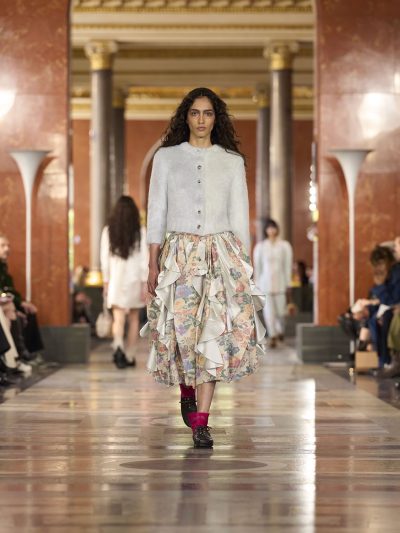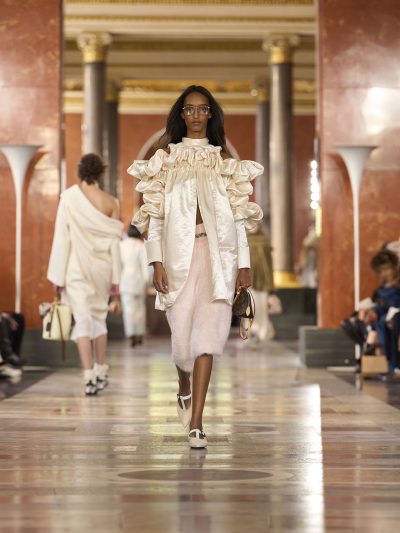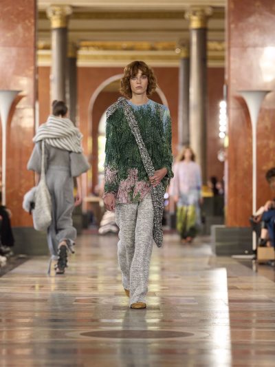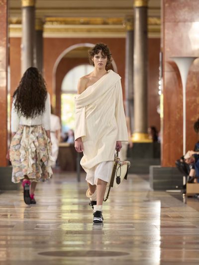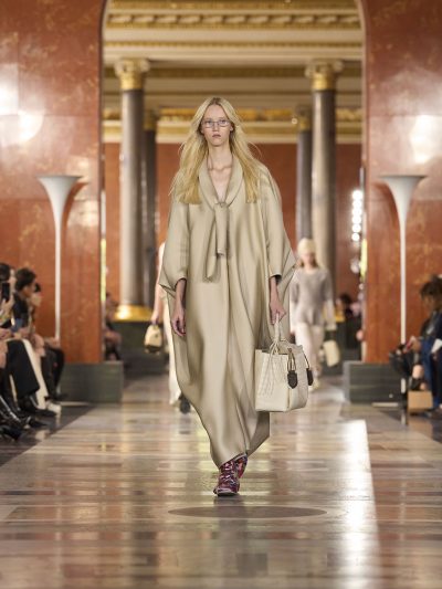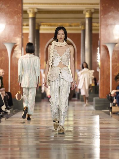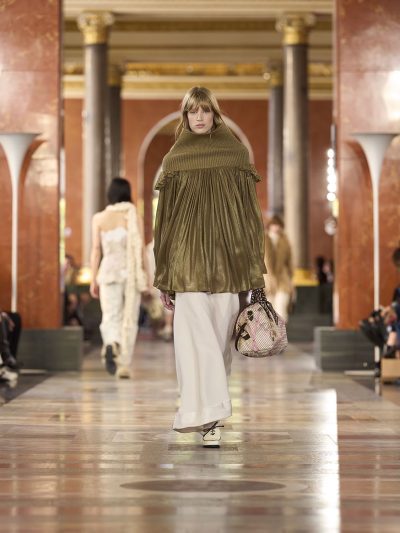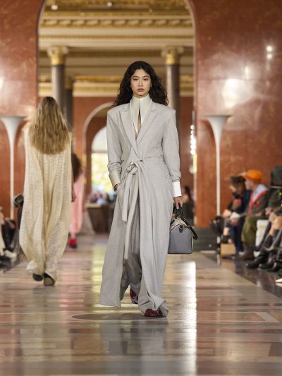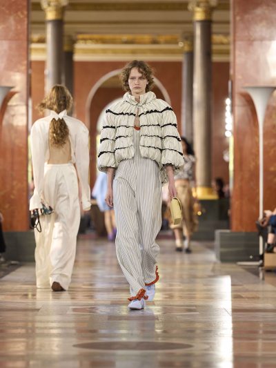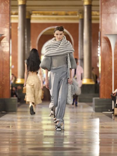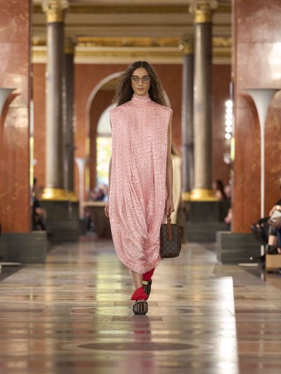 Đúng với tinh thần kể trên, giám đốc sáng tạo Louis Vuitton giới thiệu một bộ sưu tập xen kẽ giữa trang phục mặc nhà và trang phục để xuống phố. Cụ thể hơn, đó là một bộ sưu tập mai mối cái cảm giác thoải mái, tự do tự tại của trang phục mặc nhà, cùng sự bảo bọc của trang phục ra đường. Vẫn có những trang phục mỏng manh, xuyên thấu giống với những gì được giới thiệu tại các tuần lễ thời trang lớn trong mùa Xuân Hè 2026, nhưng vẫn đậm chất kiến trúc của Nicolas Ghesquière. Về mặt phụ kiện, giày moccasin và dép lê trở thành điểm nhấn chính để truyền tải cảm giác nhẹ nhõm của thời trang mặc nhà.