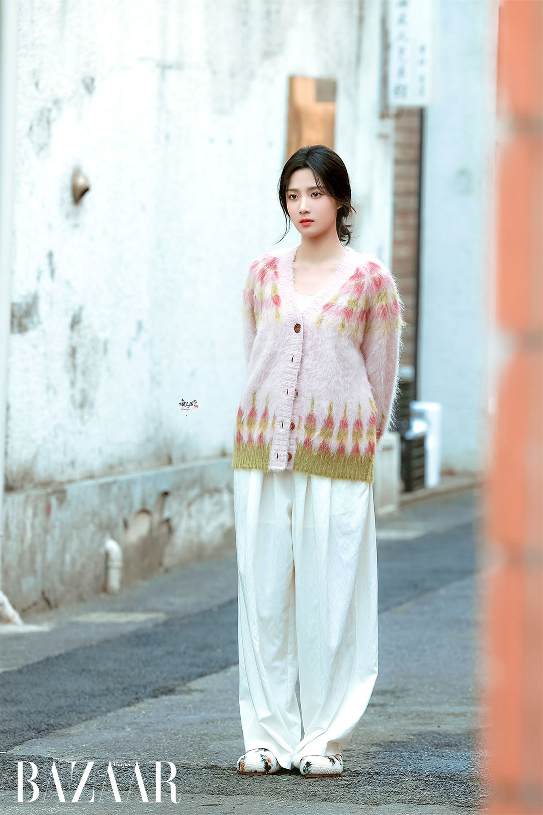 Mẹo nhỏ: Một cách phối đồ xinh xắn từ stylist Yết Hí cho Lư Dục Hiểu là tạo ra bản phối thời trang ton-sur-ton từ những điểm nhỏ trên trang phục. Ví dụ, áo cardigan lông màu hồng từ Fabrique có họa tiết hoa, đồng điệu với đôi dép hoa lá từ ForPoem.