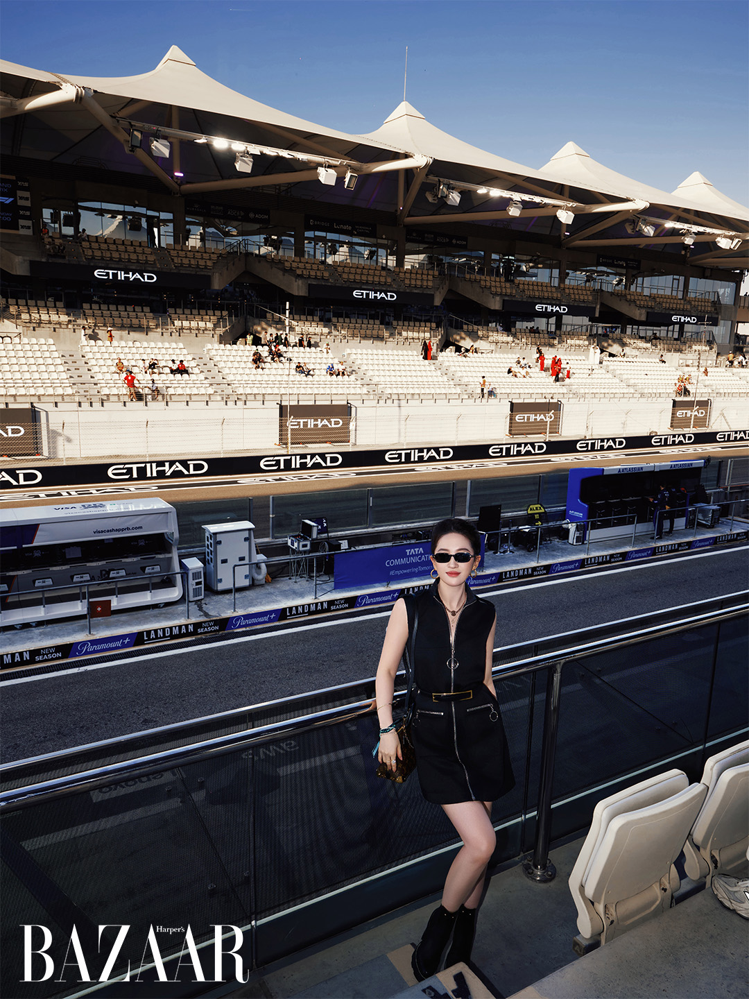 Tại khu kỹ thuật của trường đua Yas Marina, hình ảnh Lưu Diệc Phi xuất hiện như thể bước ra từ một trang bìa tạp chí thời trang quốc tế dành riêng cho những người yêu tốc độ.