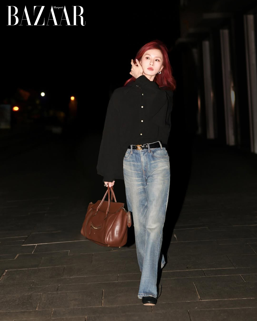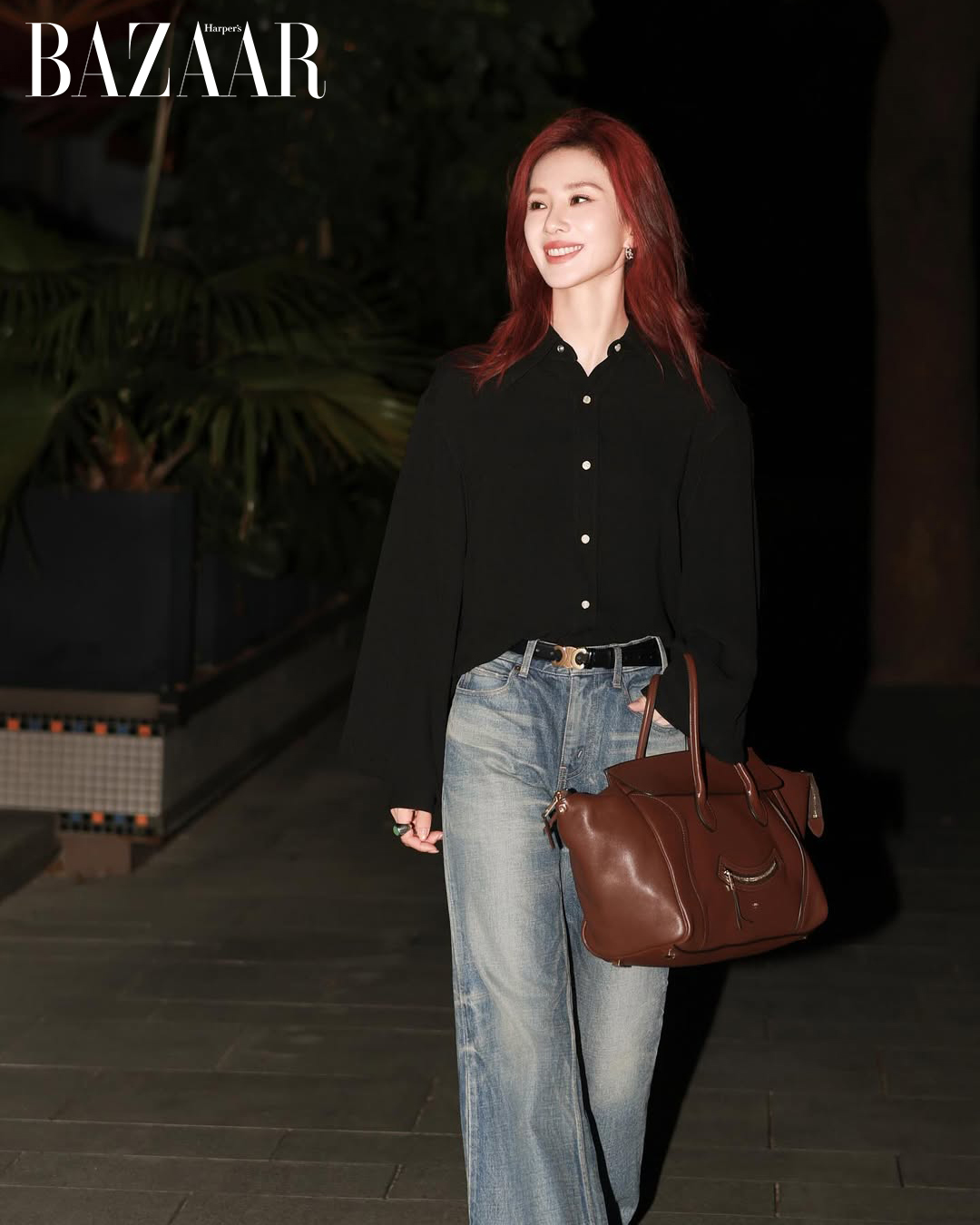 Để làm nền cho chiếc túi, Lưu Thi Thi lựa chọn một tổng thể tối giản. Cô phối áo sơ mi oversize form dáng mềm rủ, được thắt gọn lại nhờ thắt lưng Celine Triomphe 25mm hai mặt da với khóa kim loại, cùng quần jeans ống loe kiểu thịnh hành ở thập niên 1970. Trên đôi chân, sneaker Celine Lise Triomphe với họa tiết logo đục lỗ mang đến sự thoải mái, vừa giữ nhịp trẻ trung, vừa hoàn thiện tổng thể look street-chic.