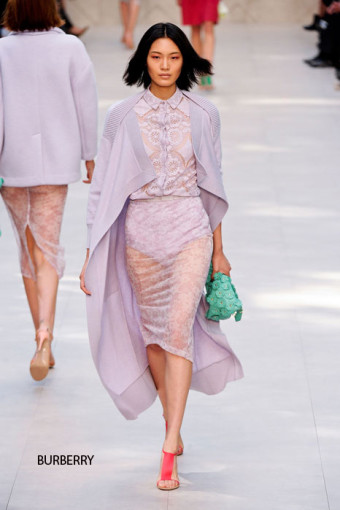 Bạn có thể nhìn thấy sự phối hợp tinh tế giữa gam tím nhạt này với vàng, xanh pastel, xanh lơ của DKNY, Burberry, Prabal Gurung… mùa Xuân – Hè 2014, tạo nên vẻ đẹp nữ tính và làm nổi bật làn da, đặc biệt rất phù hợp với màu da châu Á. Ngoài ra, một số màu khác cũng sẽ được ưu ái trong năm sau là cam, vàng, hồng cam, xanh dương đậm.