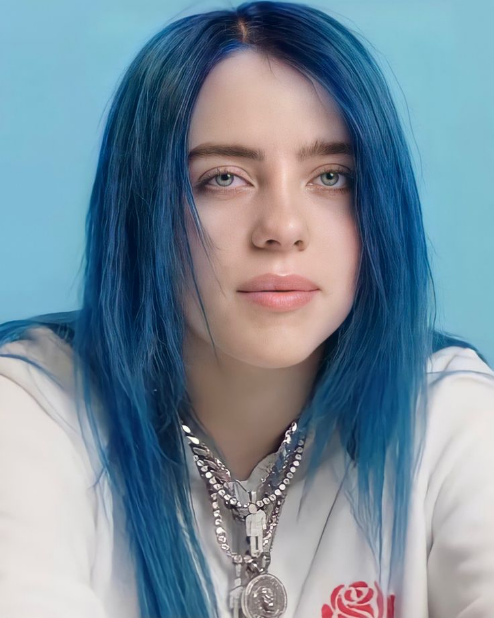 Billie Eilish từng để tóc xanh đậm ánh đen, cùng kiểu xoã tóc dài. Đây là biến thể “màu nước” rất phù hợp cho người mệnh Thủy. Ảnh: Pinterest
