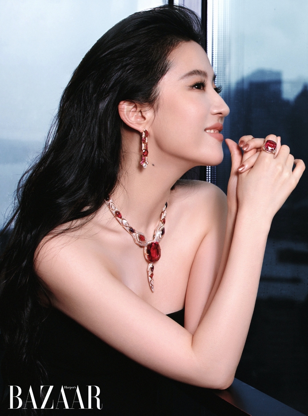 Lưu Diệc Phi với kiểu tóc chải ngược, xoăn nhẹ tựa dòng suối chảy. Ảnh: BVLGARI