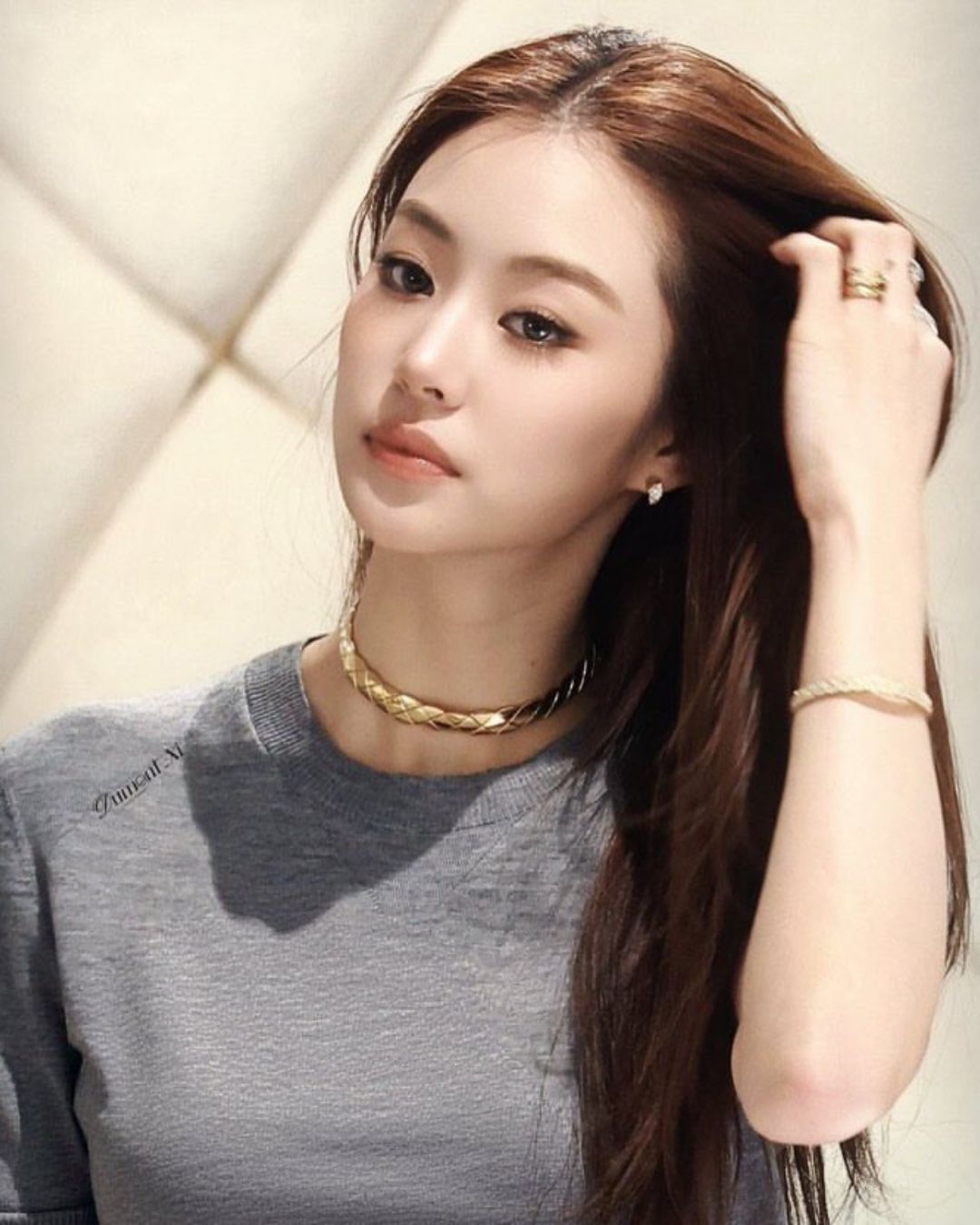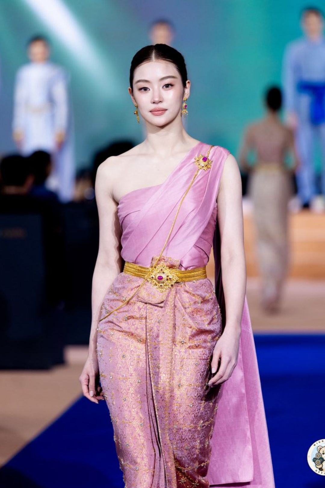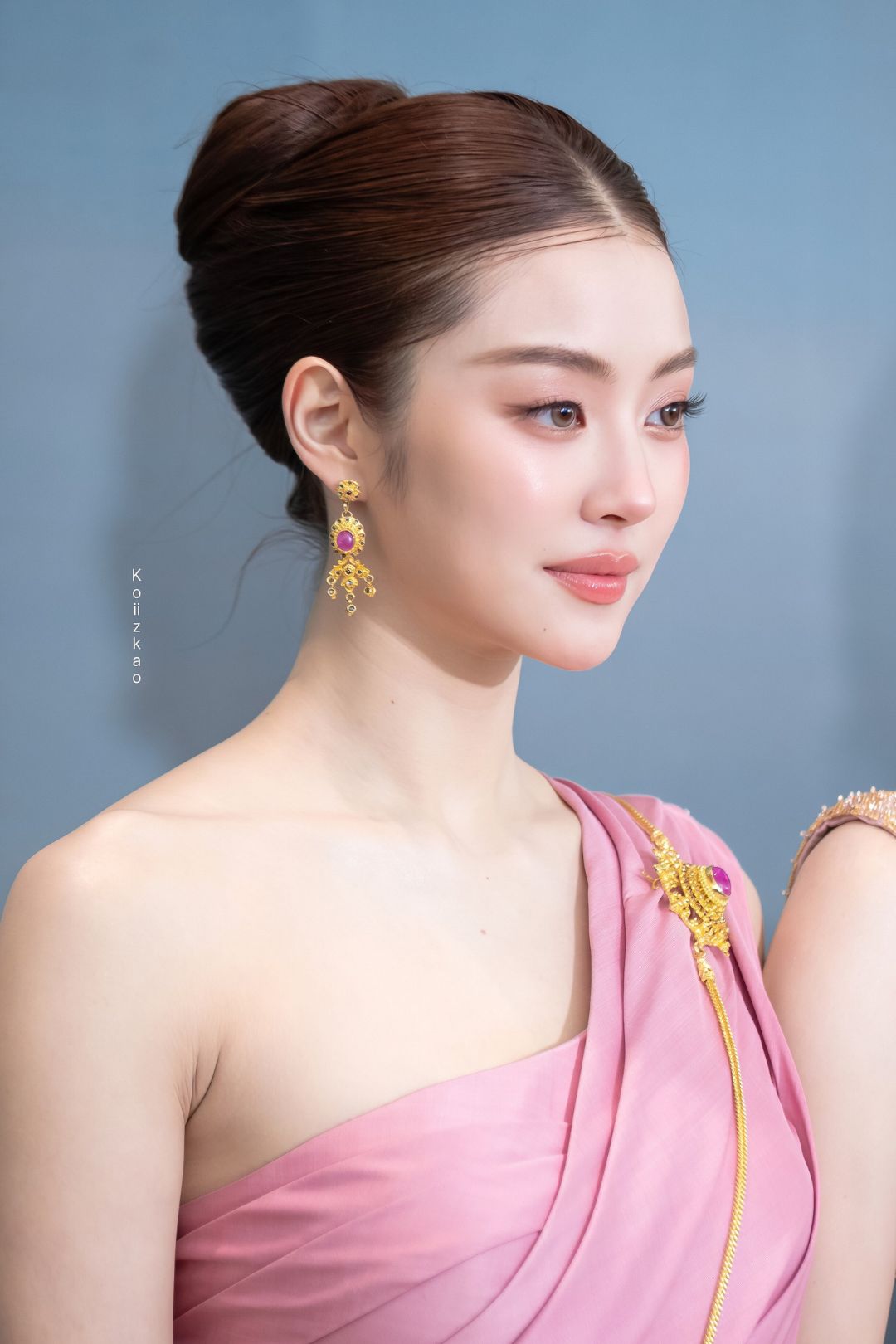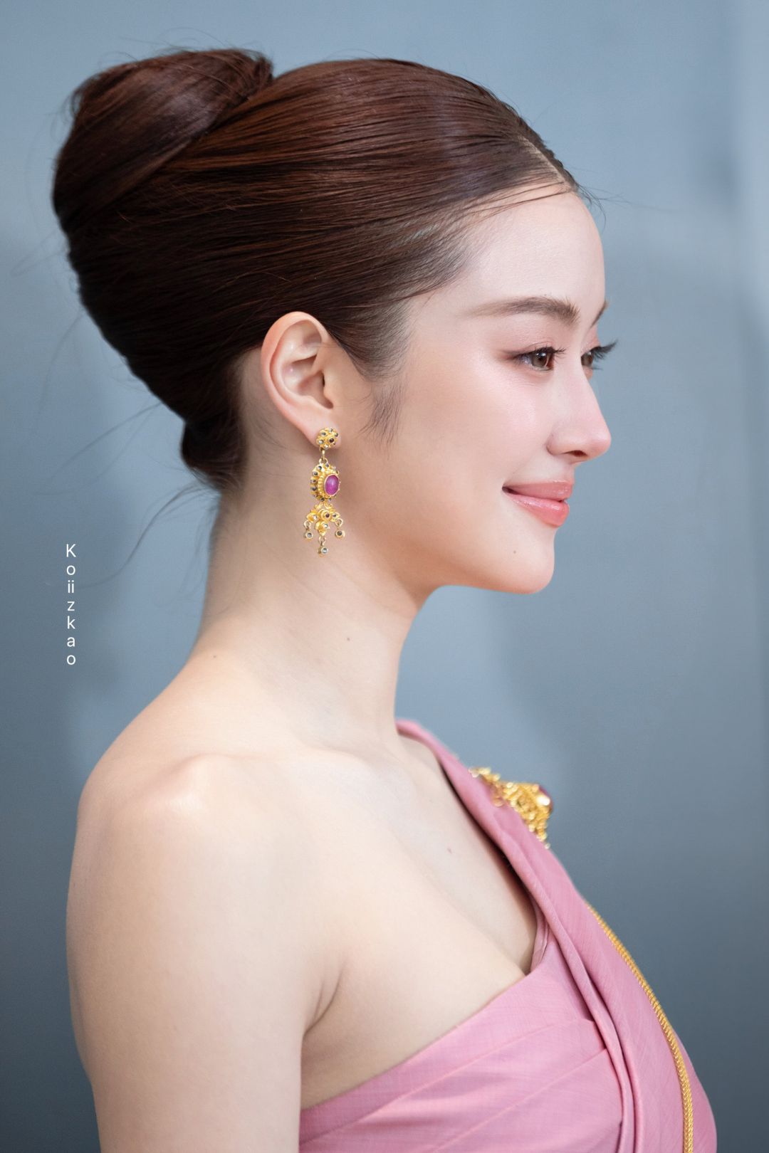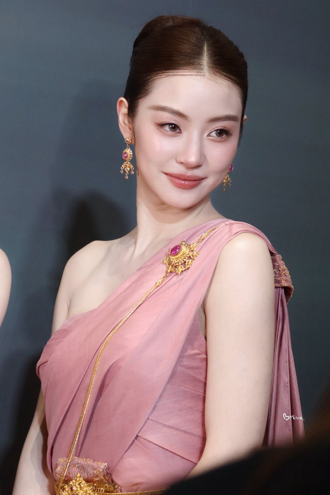 Cách trang điểm của Miu cũng được tiết chế tối đa để nhường chỗ cho vẻ đẹp tự nhiên. Lớp nền mỏng nhẹ như sương, đôi mày ngài thanh tú và sắc son hồng nude nhẹ nhàng đã tạo nên một tổng thể hài hòa tuyệt đối. Kết hợp cùng kiểu tóc búi cao gọn gàng theo truyền thống Thái Lan tạo cảm giác quý phái và không thêm bất cứ loại trâm cài hay kẹp tóc nào. Mái tóc búi cao đã tôn lên phần trán cao, chiếc cổ thanh mảnh cùng bờ vai “mắc áo” của Miu.