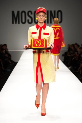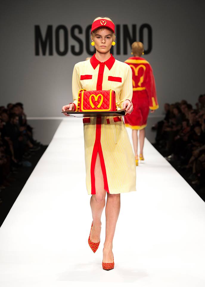 Mở màn là hai gam đỏ vàng nổi bật của ông lớn trong ngành fast food McDonalds. Các cô người mẫu như những người phục vụ sành điệu nhất trong những bộ đồng phục mang logo cách điệu từ chữ M của McDonalds và biểu tượng trái tim của Moschino.
