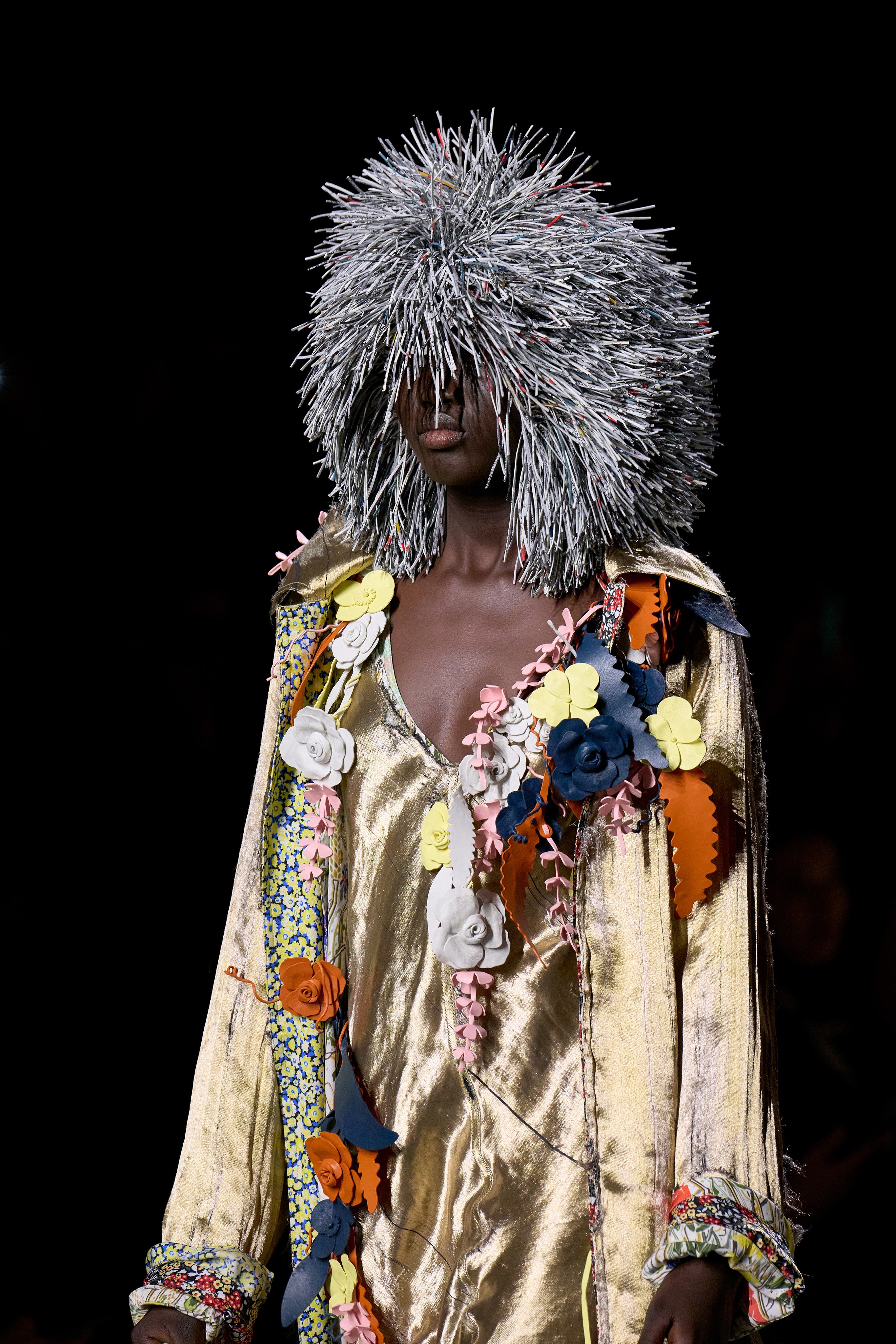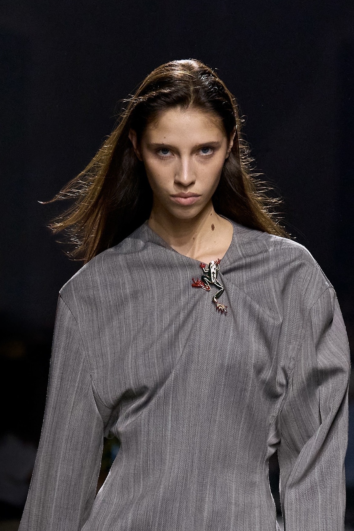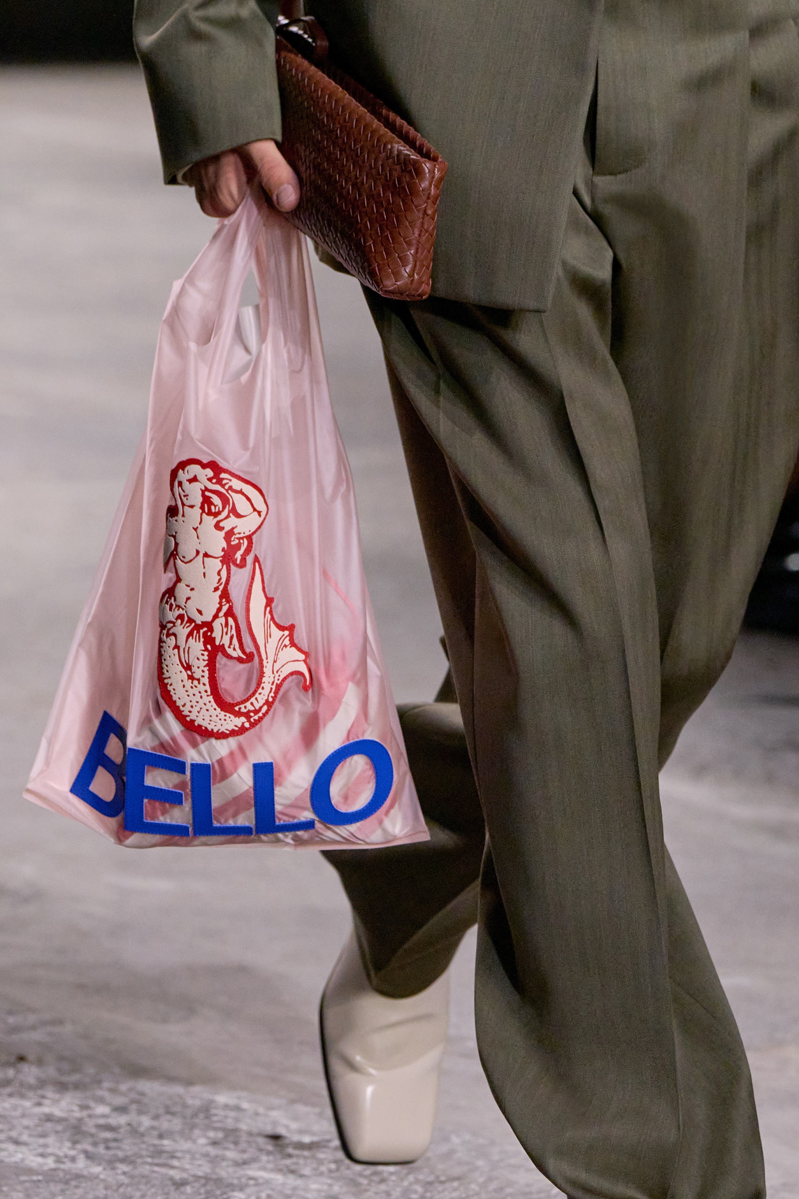 Nhìn đời qua con mắt trẻ thơ, Bottega Veneta như lấy bối cảnh một buổi chiều trước cổng trường mẫu giáo. Những ông bố trước khi đến đón con đã mua món quà vặt, mẹ mua vừa từ siêu thị mua ít hoa cho gia đình. Matthieu Blazy điểm tấu những hình bóng công sở thường nhật bằng trí tưởng tượng thơ trẻ, không chỉ qua kích cỡ oversize, mà còn qua những nếp gấp, yếu tố đính kết trừu tượng, siêu thực. Những chiếc túi trở thành canvas vẽ tranh, nếp gấp trên áo là lỗi của chú thằn lằn, mái tóc xù như được đan bằng hoa giấy sặc sỡ.