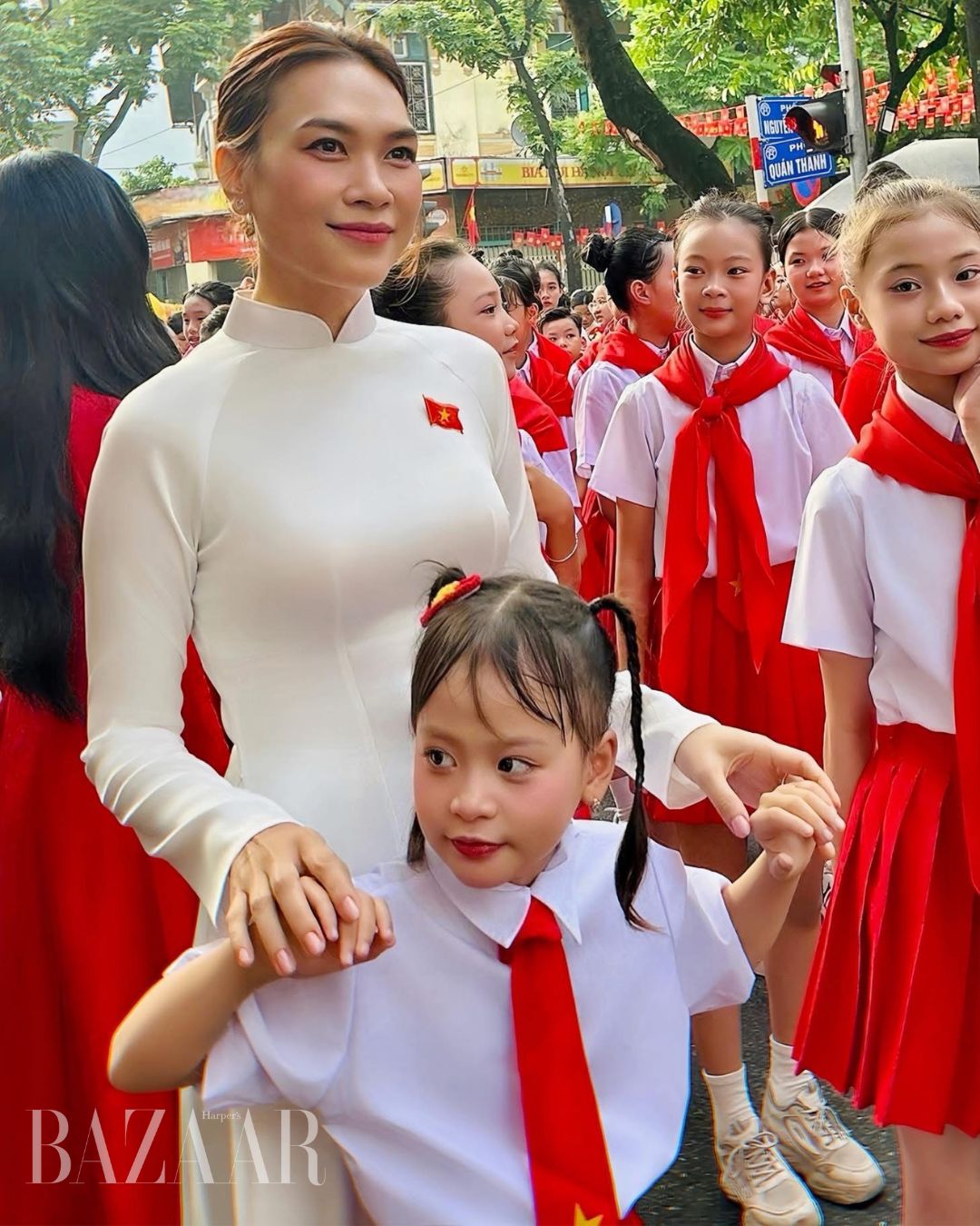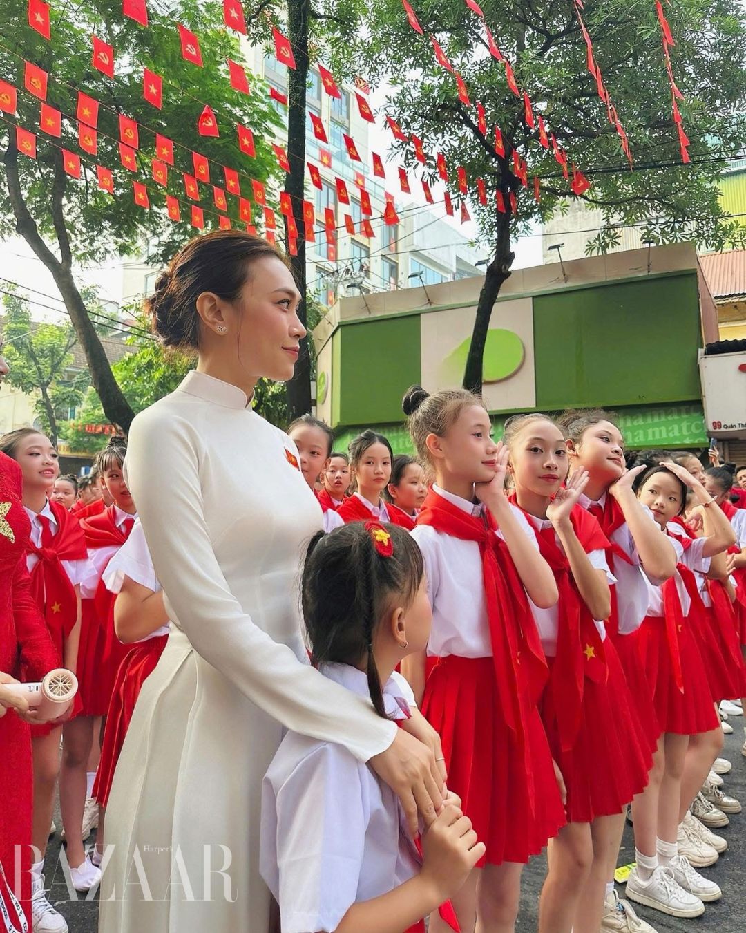 Trước khi chương trình chính thức bắt đầu, những khung hình ghi lại cảnh Mỹ Tâm tham gia buổi tổng duyệt tại sân vận động quốc gia Mỹ Đình cũng nhanh chóng phủ sóng mạng xã hội. Trong chiếc áo dài trắng tinh khôi, dáng vẻ thanh thoát như một nhành hoa sớm mai. Bên cạnh cô là dàn thiếu nhi trong đồng phục đỏ rực, những chiếc khăn quàng bay nhẹ theo gió, tạo nên bức tranh đối lập mà hài hòa: sự dịu dàng trưởng thành sánh đôi cùng sức sống hồn nhiên.