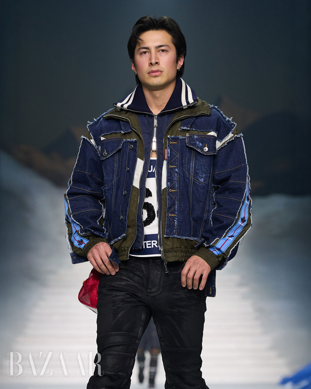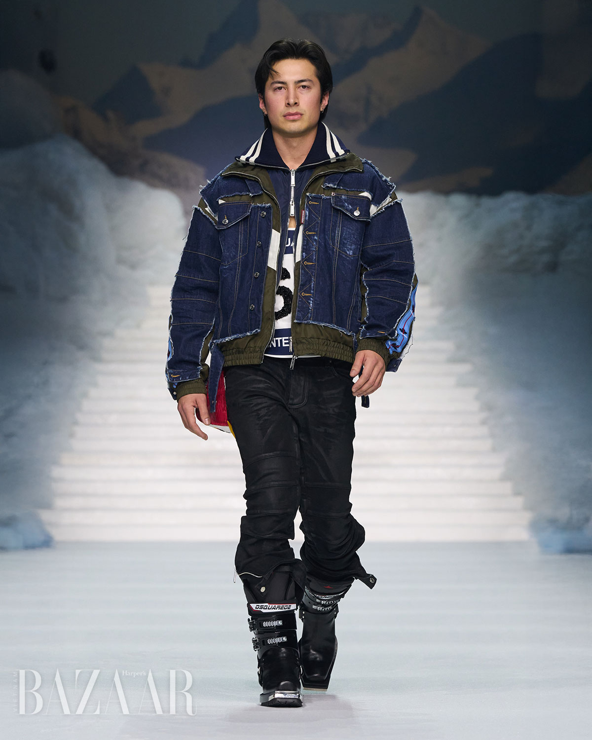 Phản ánh nhu cầu ăn vận trong mùa lạn, Dsquared2 mang đến bộ sưu tập gồm các mẫu áo khoác phao, trang phục thể thao, các layer giữ ấm – nói chung là những item cần thiết cho những chuyến đi chinh phục đường đua trên băng và tuyết. Bản thân Hudson Williams lại mặc trang phục casual hơn, gồm áo khoác denim và quần jeans. Chi tiết duy nhất kết nối anh với vai diễn Shane Hollander của mình là đôi giày chơi hockey.