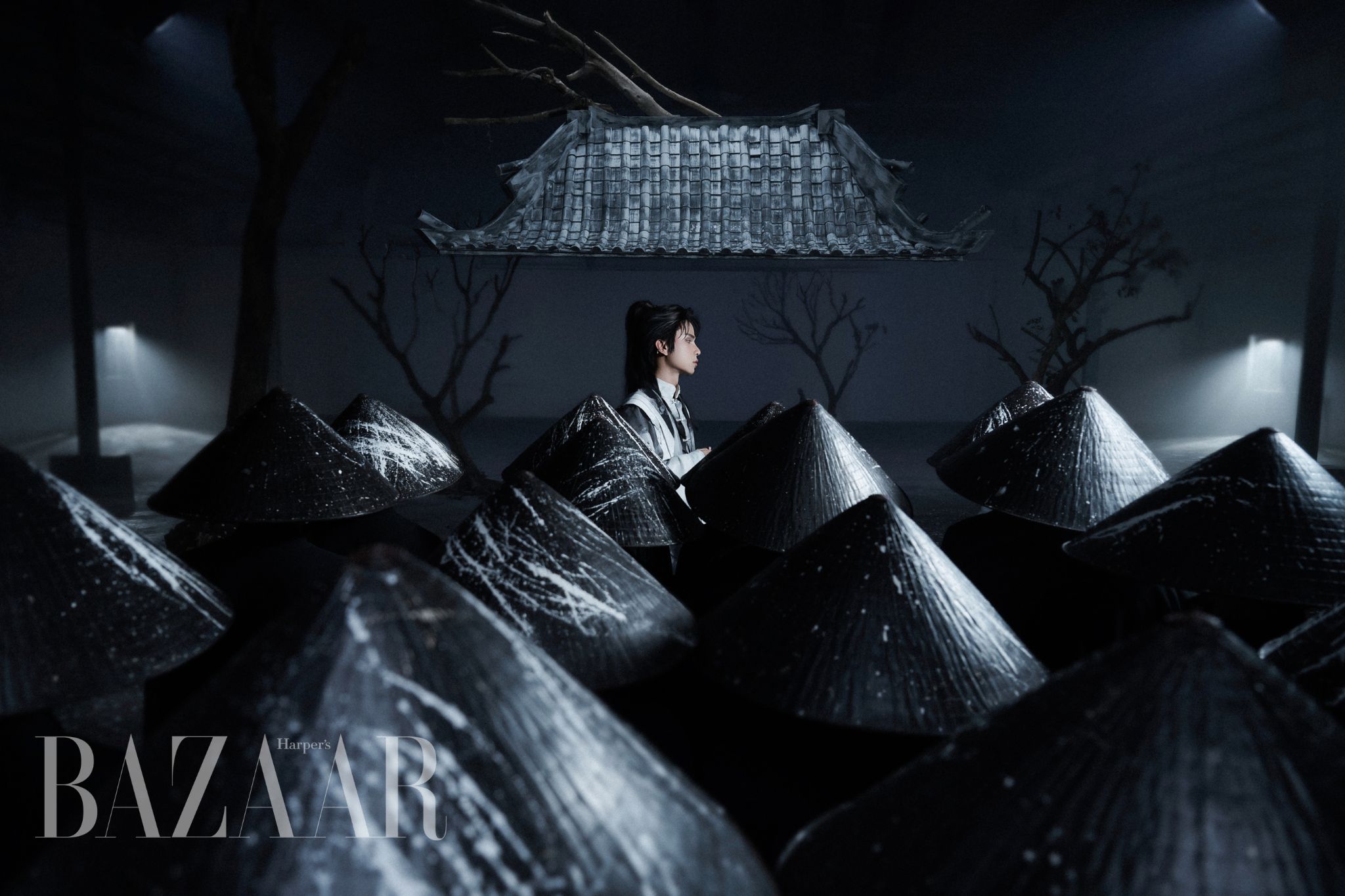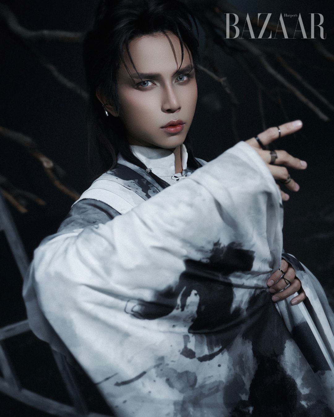 Thời trang trong Si cũng đi theo tinh thần thủy mặc ấy. Bộ trang phục nhiều lớp, tay áo rộng đón gió, chất vải nhuộm loang như vệt mực tàu tạo cảm giác chuyển động mà vẫn tĩnh tại. Tóc dài được buộc cao, phụ kiện nhẫn xếp tầng cùng đường kẻ eyeliner mảnh tạo nên diện mạo androgynous, vừa sắc lạnh vừa mềm mại. Trong từng cú lia máy, khi tay áo xoay tròn, hiệu ứng thị giác chẳng khác nào một nét bút tung mực trên nền giấy, nhấn nhá cho giai điệu đang chảy.