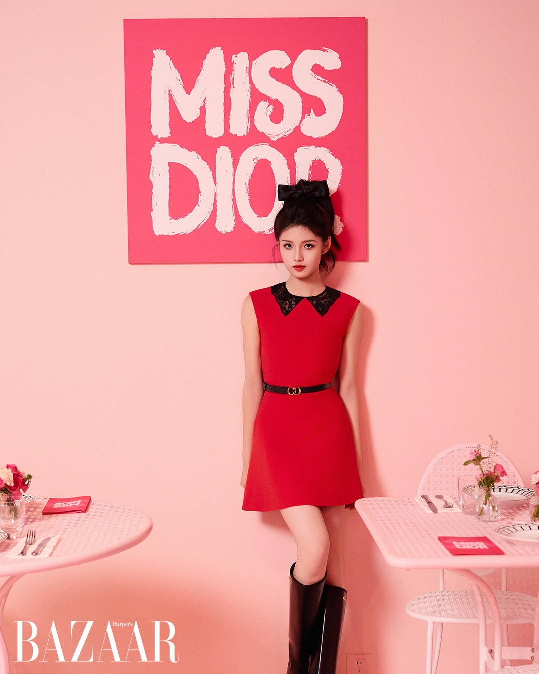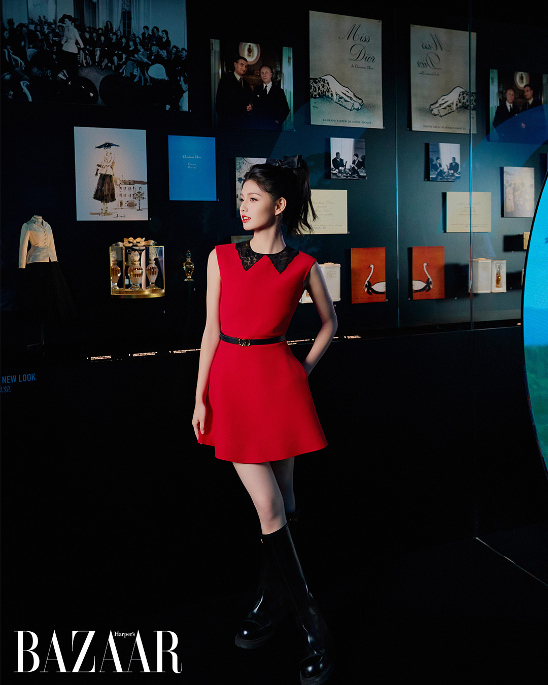 Màu đỏ của Rouge Dior được Ngải Mễ tái hiện qua bộ cánh ở sự kiện. Lõi son như thể hiện qua chiếc váy đỏ Dioramour Short Dress, còn cổ áo ren đen, thắt lưng C’est Dior Belt Black Smooth Calfskin khéo léo ôm lấy vòng eo và đôi bốt D-Town Boot Black Supple Calfskin như phần nắp bên ngoài. Xinh xắn, trẻ trung nhưng vẫn kinh điển.