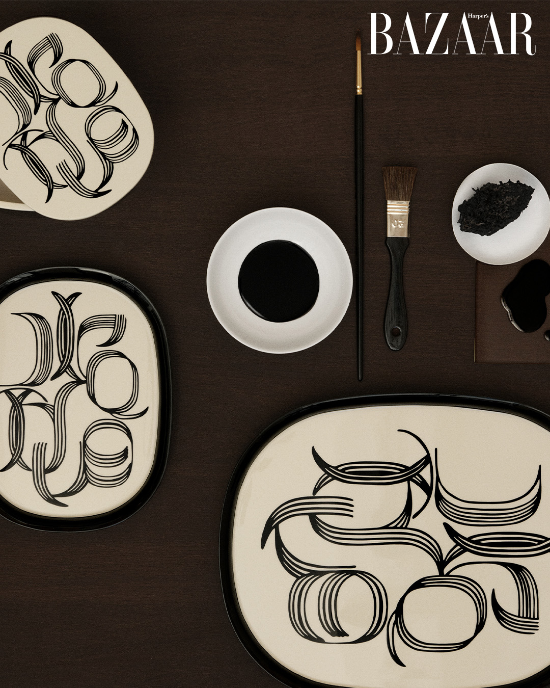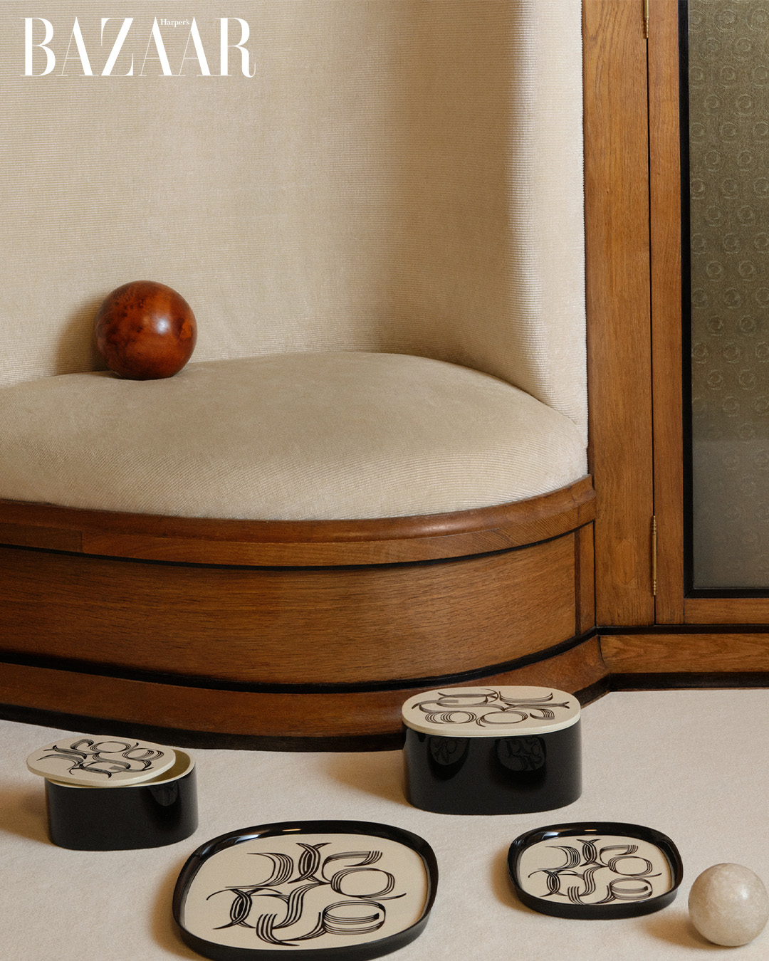 Bộ sưu tập bao gồm bốn tác phẩm thủ công: hai khay trang trí và hai hộp lưu trữ, được thiết kế với bảng màu ngà và đen trầm mặc. Những đường nét elip đặc trưng cùng kiểu chữ Typovalo do nghệ sĩ Florence Bamberger sáng tạo được đưa vào bề mặt sơn mài như một dấu ấn nhận diện. Các món đồ mang tính ứng dụng linh hoạt, có thể hiện diện trên bàn làm việc, kệ sách hay bàn trà, vừa đóng vai trò vật dụng thường nhật, vừa như những “tiểu phẩm di sản” hiện diện trong không gian sống.