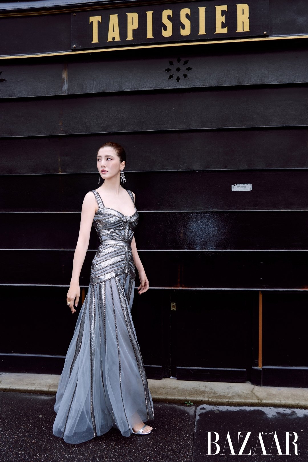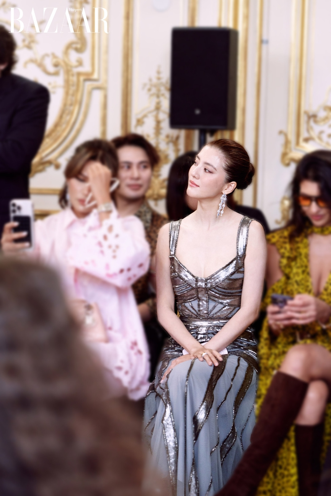 Dự front row, Ngô Thiên Ngữ chọn chiếc đầm Tony Ward đính sequin ánh bạc rực rỡ. Thiết kế này thật sự rất khó mặc nhưng Ngô Thiên Ngữ, với vóc dáng hoàn hảo, đã cân đẹp trang phục.