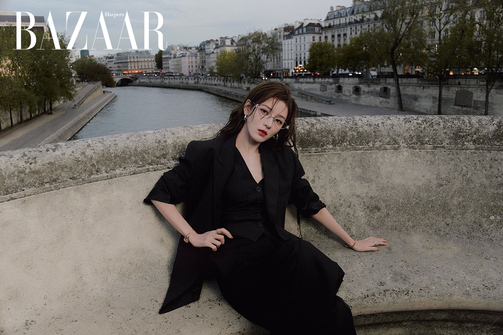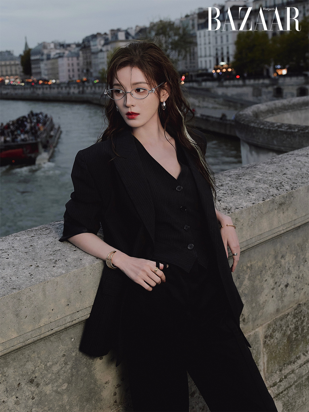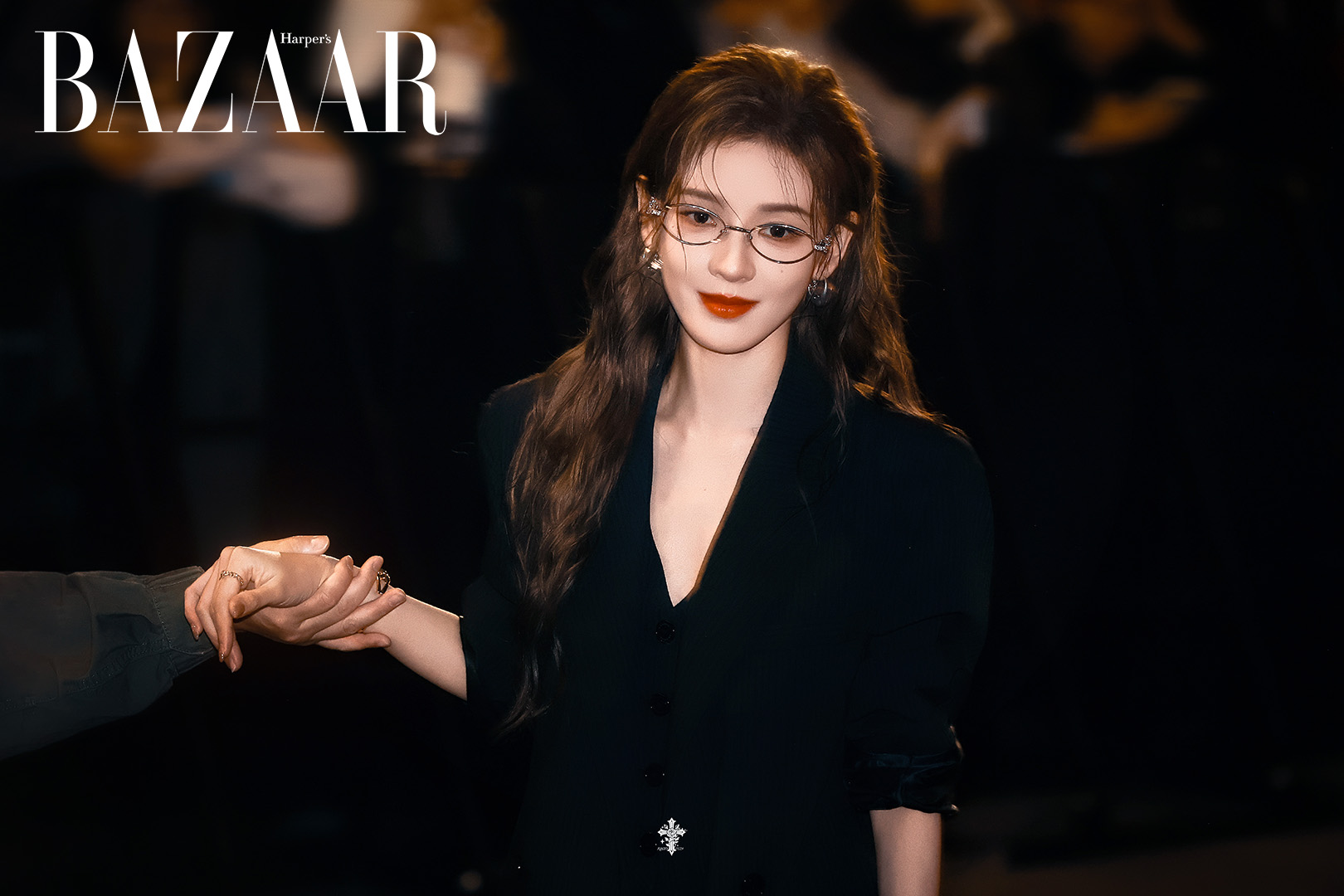Tạo hình này càng thêm cuốn hút nhờ kính gọng bạc đính đá. Xu hướng kính không gọng/gọng mảnh đang được các sao châu Á ưa chuộng tạo điểm chấm phá tri thức, khiến cô như một sếp lớn chốn công sở. Đó chính là hình mẫu của một ngự tỷ, người phụ nữ mạnh mẽ không cần dựa dẫm vào ai để đạt được những gì mình mong muốn trong cuộc sống.