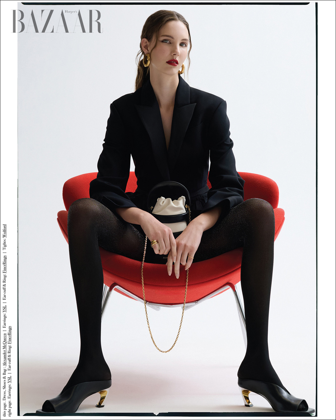 Dress, shoes & bag, Alexander McQueen. Earrings, YSL. Ear cuff & ring, FinerRings. Tights, Wolford.