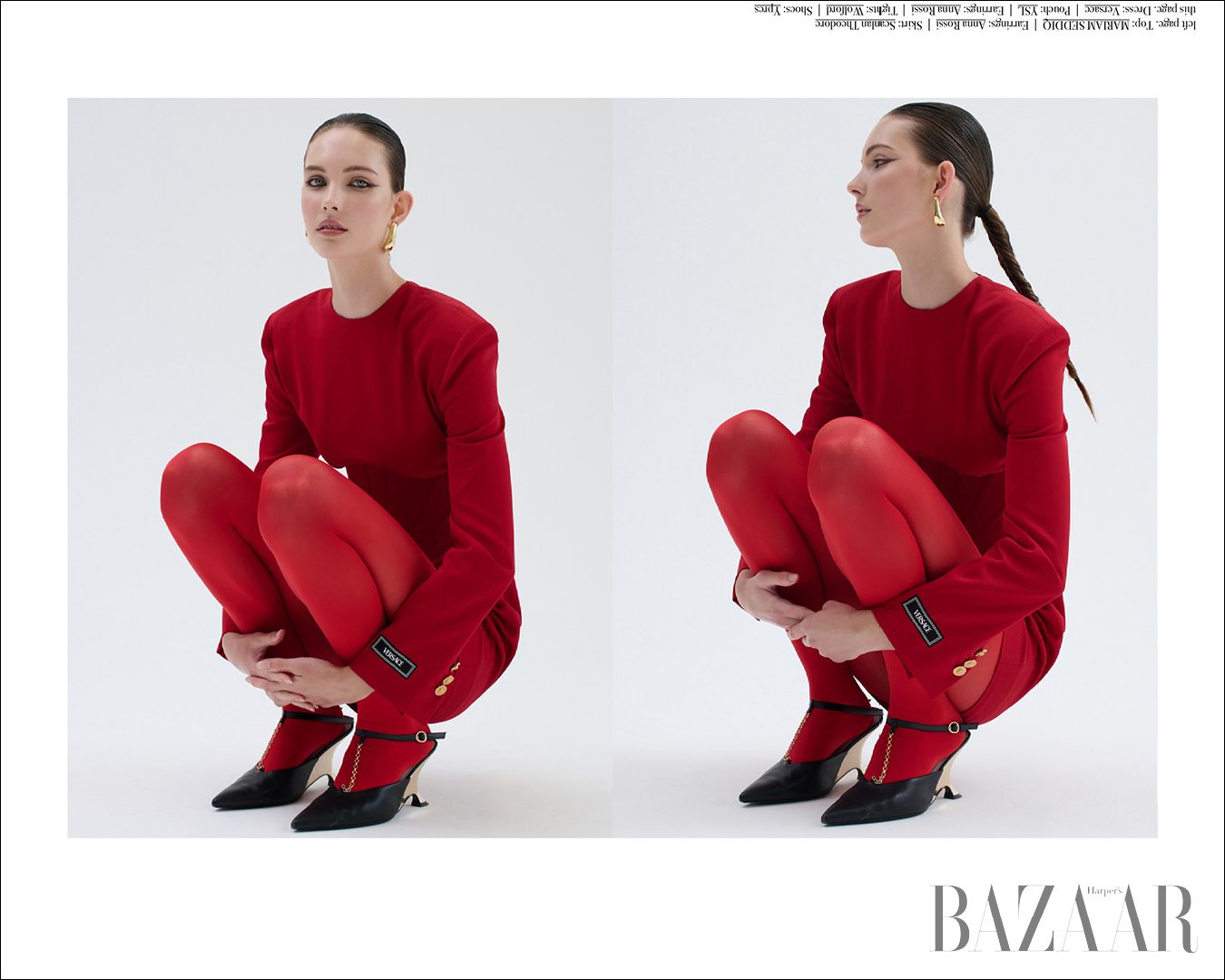 Dress, Versace. Earrings, Anna Rossi. Tights, Wolford. Shoes, Ypres.