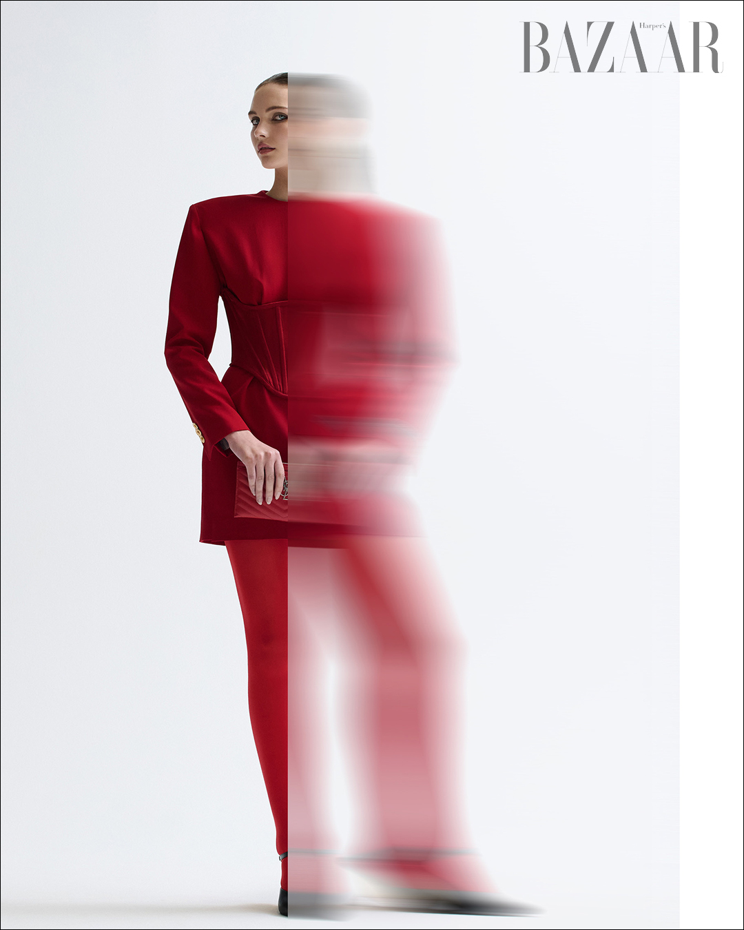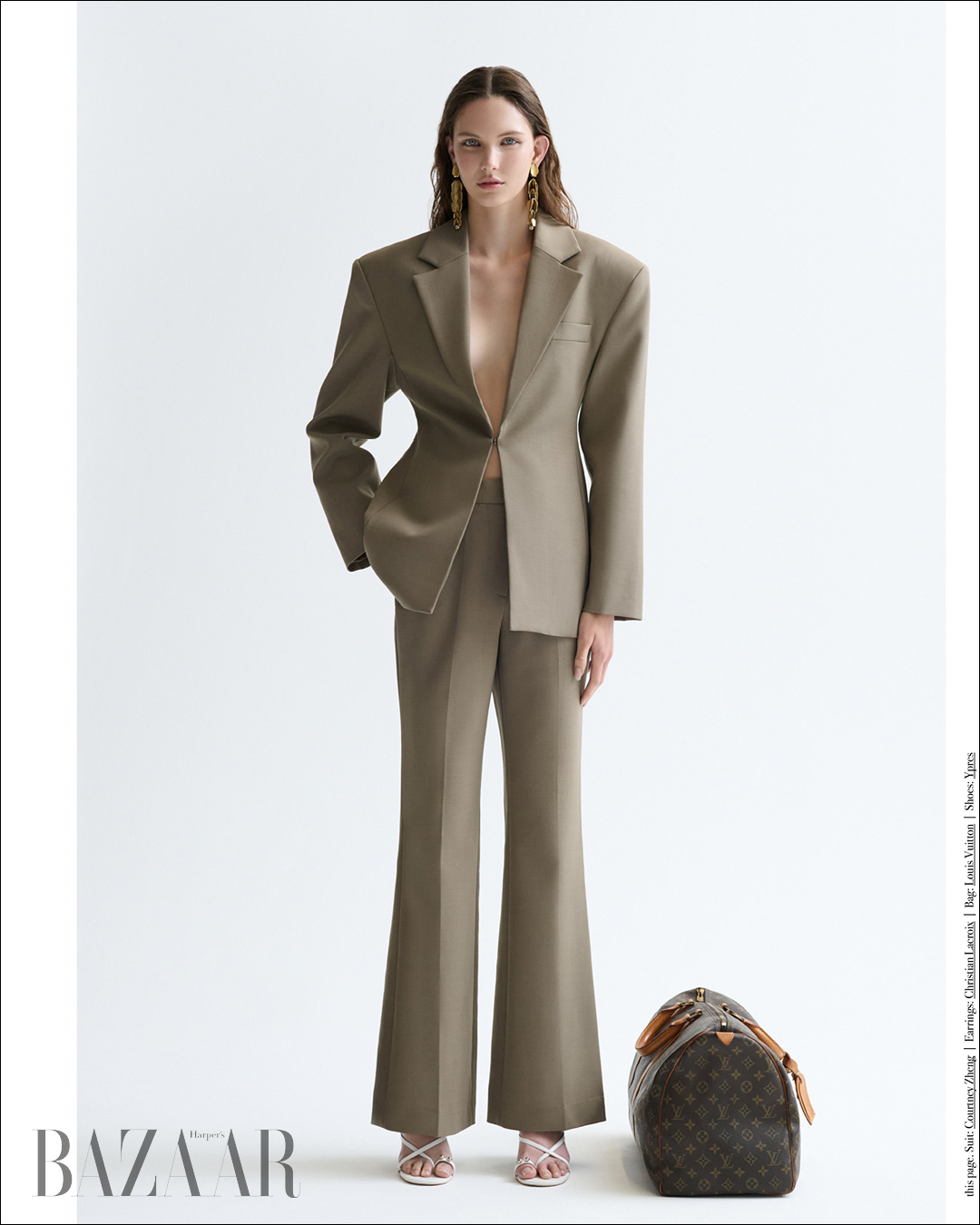 Suit, Courtney Zheng. Earrings, Christian Lacroix. Bag, Louis Vuitton. Shoes, Ypres.