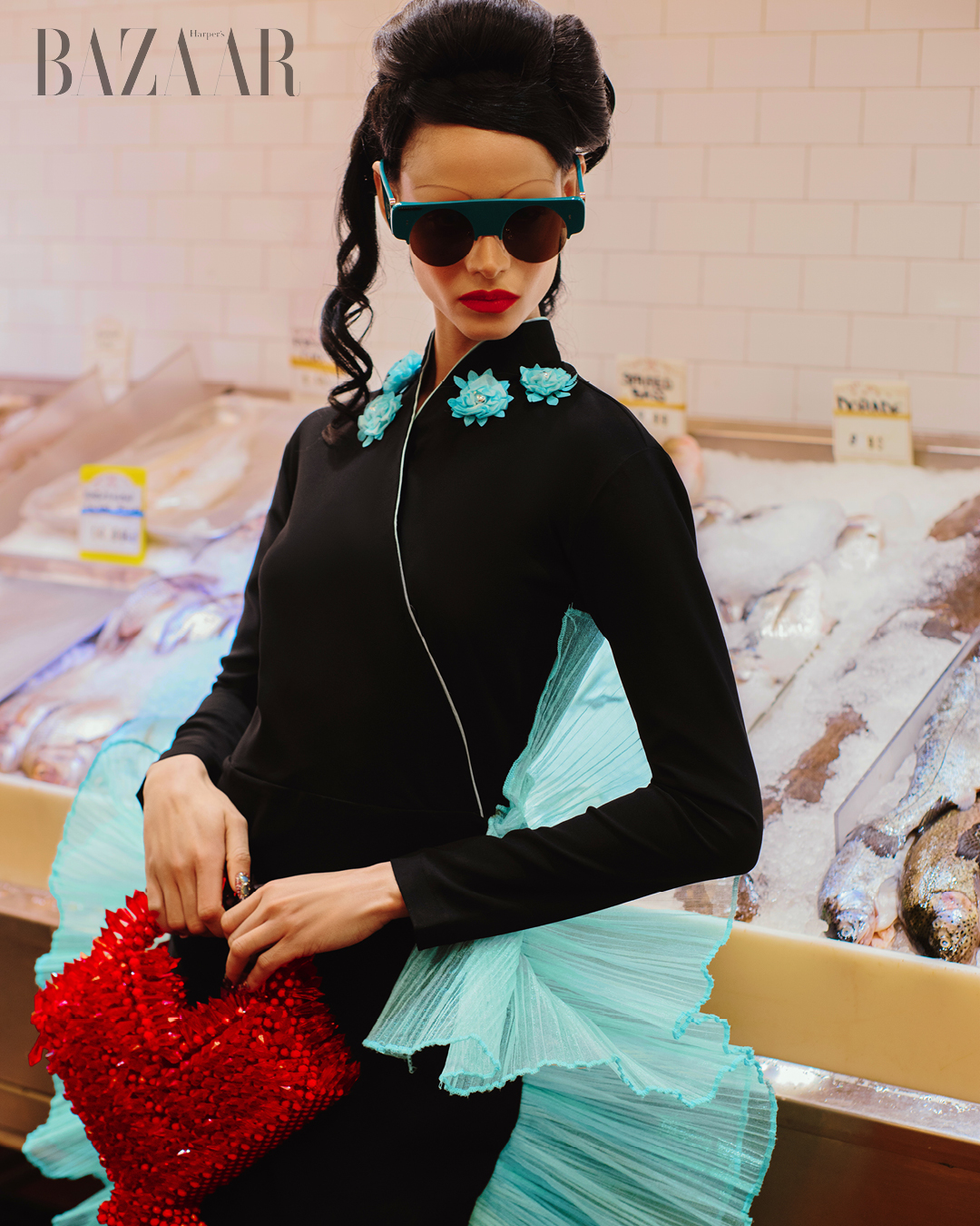 Đầm: Nazarene Amictus. Kính: The Confessional Showroom NYC. Túi xách: Nazarene Amictus.