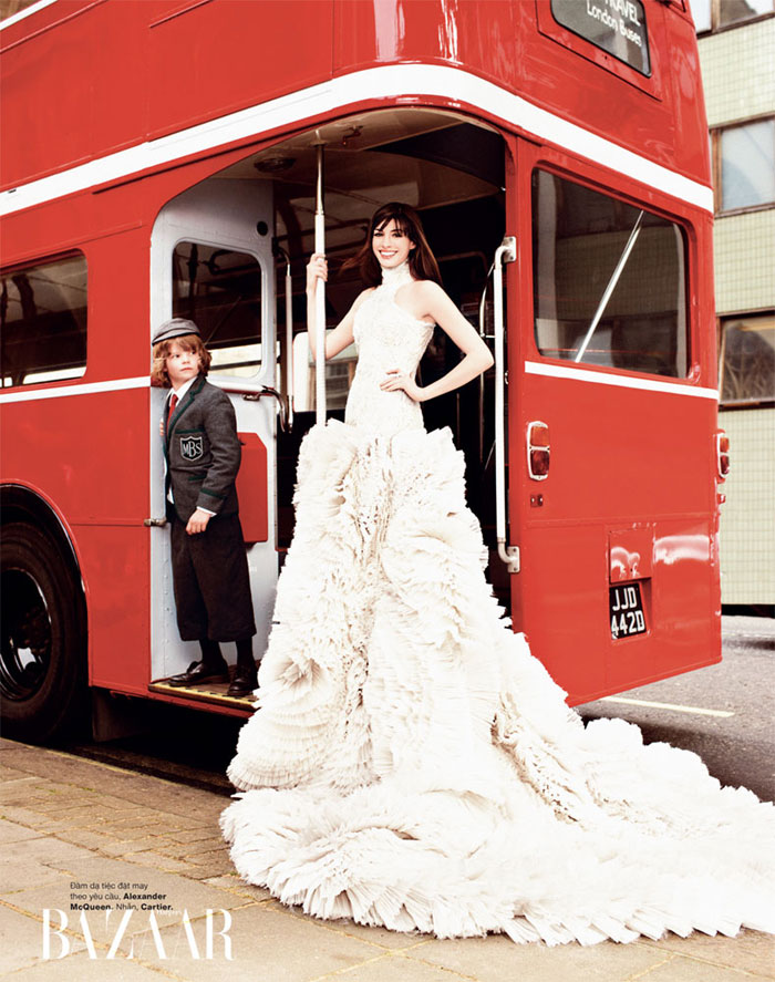 Trong quá trình thực hiện bộ ảnh cho Bazaar, nữ điệp viên quyến rũ trong Get Smart rất nhiều lần thổ lộ với tôi về sự may mắn của mình khi được khoác lên mình những bộ trang phục lộng lẫy của các nhà thiết kế hàng đầu trong những năm qua. Ngoài đời, hầu hết các bộ trang phục của Anne Hathaway mặc thường đến từ các hãng thời trang nổi tiếng như Isabel Marant hay Vivienne Westwood.