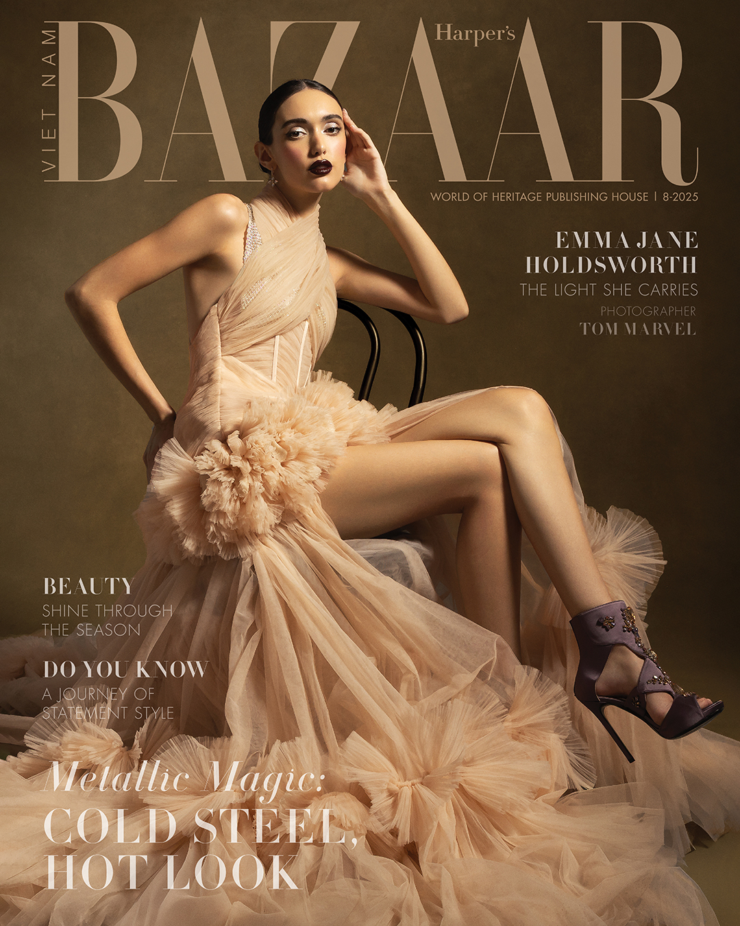 Emma Jane Holdsworth on Harper’s Bazaar Vietnam, August 2025. Gown, Manuel Tiscareno from The Confessional Showroom NYC. Earrings, Doves by Doron Paloma.
