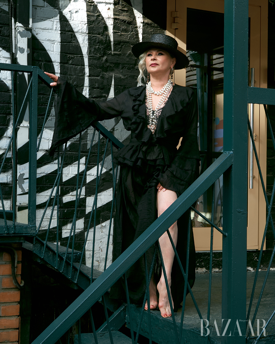 Áo: Tallulah and Hope. Váy khiêu vũ. Giày: Poeve. Bông tai: Patricia Bruni. Vòng tay: Melrosia. Găng tay và dù của stylist.