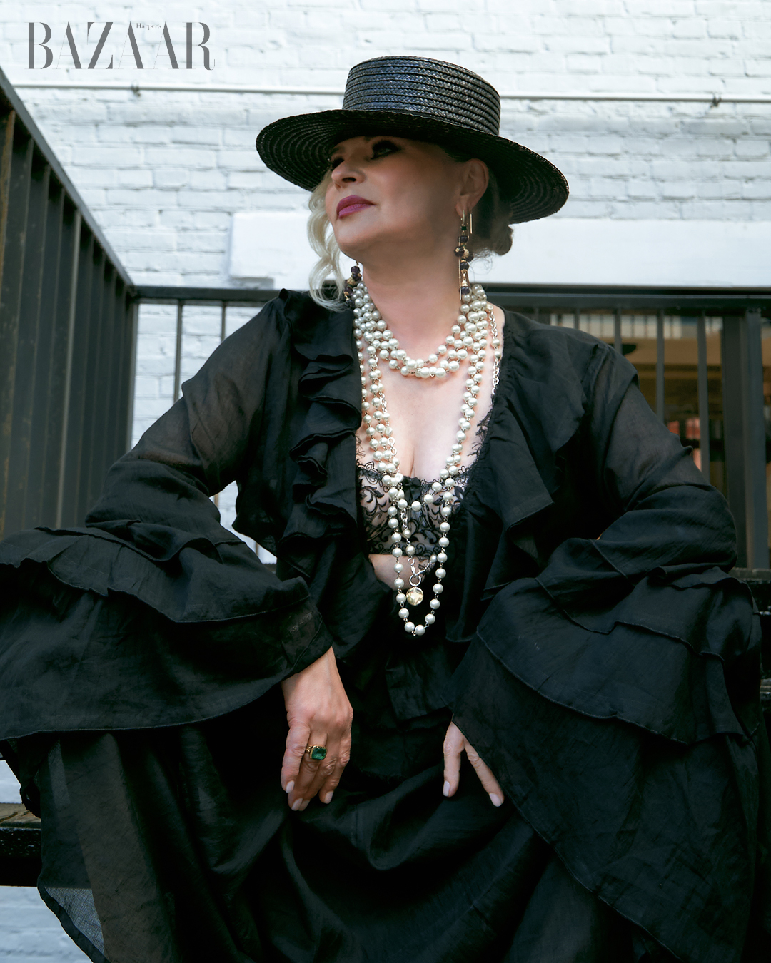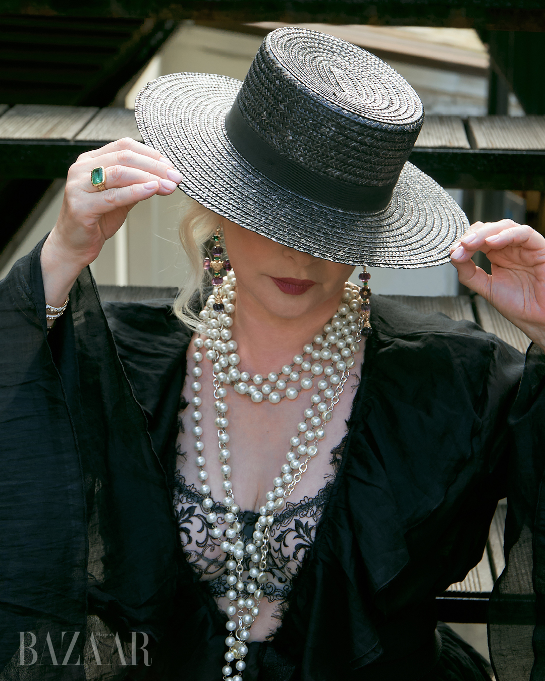 Đầm: A Perfect Nomad. Nón và vòng cổ hạt trai: Max Mara. Bông tai: Patricia Bruni.