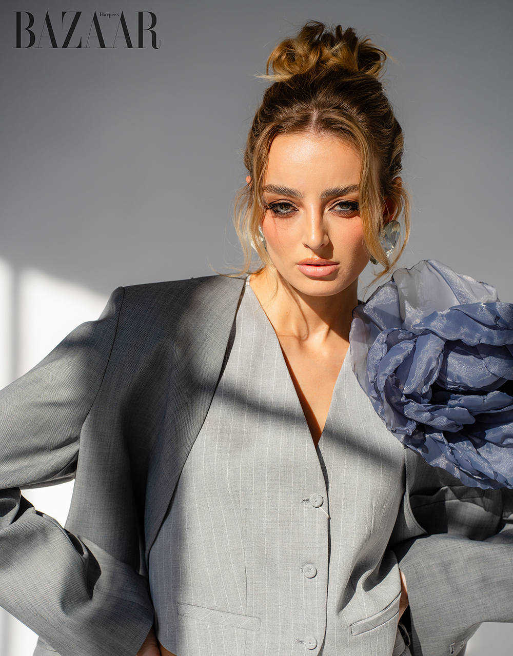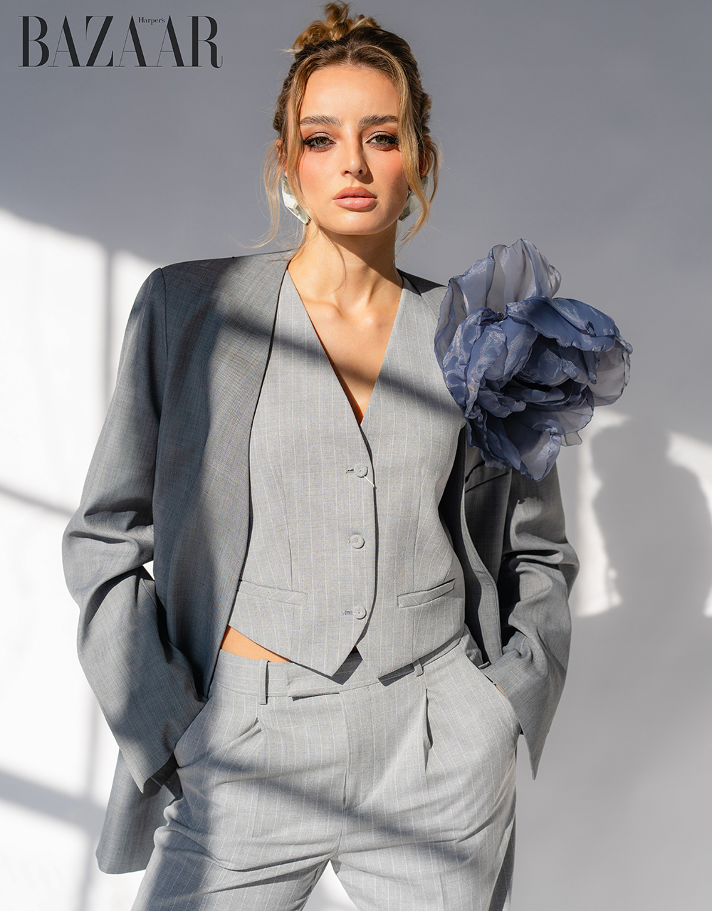 Suit, MNG. Blaser, The Frankie Shop. Flower brooch, Oksana Forbatok. Shoes, Steave Madden. Accessories, MNG.