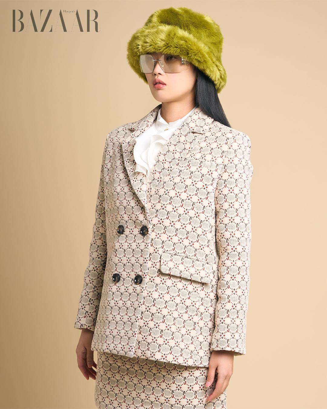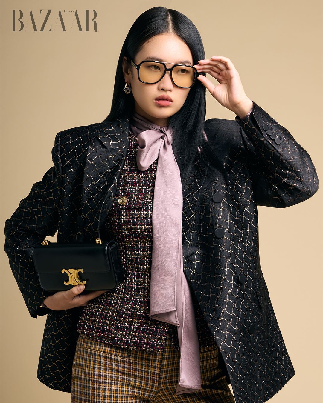 Áo blazer: Zhyun.k. Sơ-mi, vest, quần và giày: Zara. Túi: Celine. Kính: Saint Laurent.