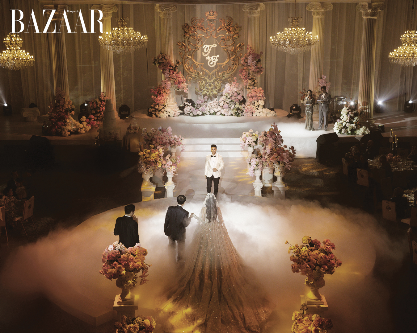 Khi cánh cửa mở vào đại sảnh La Mã, cảnh tượng như chuyển sang một chương hoàn toàn khác: trần cao, cột Roman, rèm lụa trắng, ánh sáng địa đàng và hiệu ứng 3D mapping 360 độ tạo nên không gian huy hoàng như thước phim điện ảnh. Âm nhạc, trái tim của buổi lễ, dàn dựng bởi đạo diễn âm nhạc Dustin Tiêu cùng giọng ca của Văn Mai Hương, Cẩm Ly và Đàm Vĩnh Hưng. Mỗi khoảnh khắc đều trau chuốt để chạm đến trái tim: ánh sáng rọi xuống khi cô dâu xuất hiện, nhịp bước chậm rãi như vẽ nên từng đường cảm xúc, và khoảnh khắc doanh nhân Johnathan Hạnh Nguyễn nắm tay ái nữ để trao cho chú rể. Tất cả tạo nên sự thiêng liêng mà ai có mặt cũng cảm nhận.