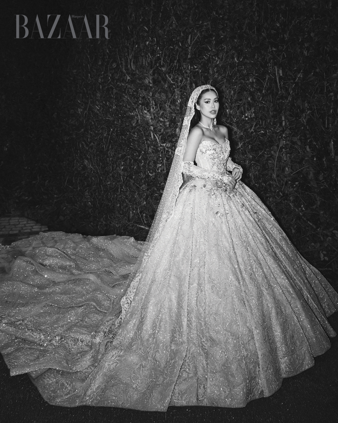 Chiếc váy cưới may đo từ The Atelier by Professor Jimmy Choo phủ sắc beige mềm mại như ánh nắng sớm, khơi gợi sự thiêng liêng của nghi thức. Trong bộ ảnh, tân nương còn khoác lên mình thiết kế váy cưới, khăn voan và găng tay từ Montsand. Đây là một kiệt tác tiêu tốn đến 3.000 giờ lao động thủ công của hơn 20 nghệ nhân đính kết cùng tham gia chế tác để tạo nên tác phẩm mang vẻ đẹp tinh xảo và tràn đầy sức sống.