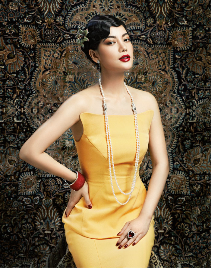 Hoa tai đính ngọc lục bảo đỏ, vòng cổ vàng trắng, ngọc trai và kim cương, vòng tay ngọc trai, nhẫn kim cương và đá spessartine màu đỏ (tay trái), nhẫn kim cương (tay phải), Damian by Mischelle