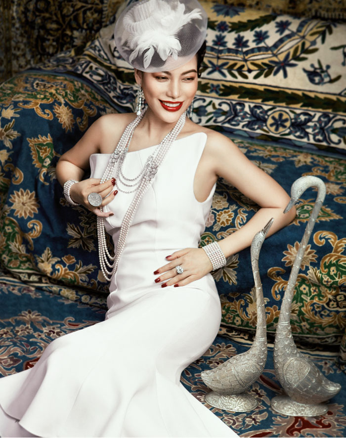 Hoa tai kim cương, vòng cổ dài kết ngọc trai đeo cùng vòng cổ kim cương, nhẫn kim cương tấm (tay phải), nhẫn kim cương 18 carat (tay trái), Damian by Mischelle