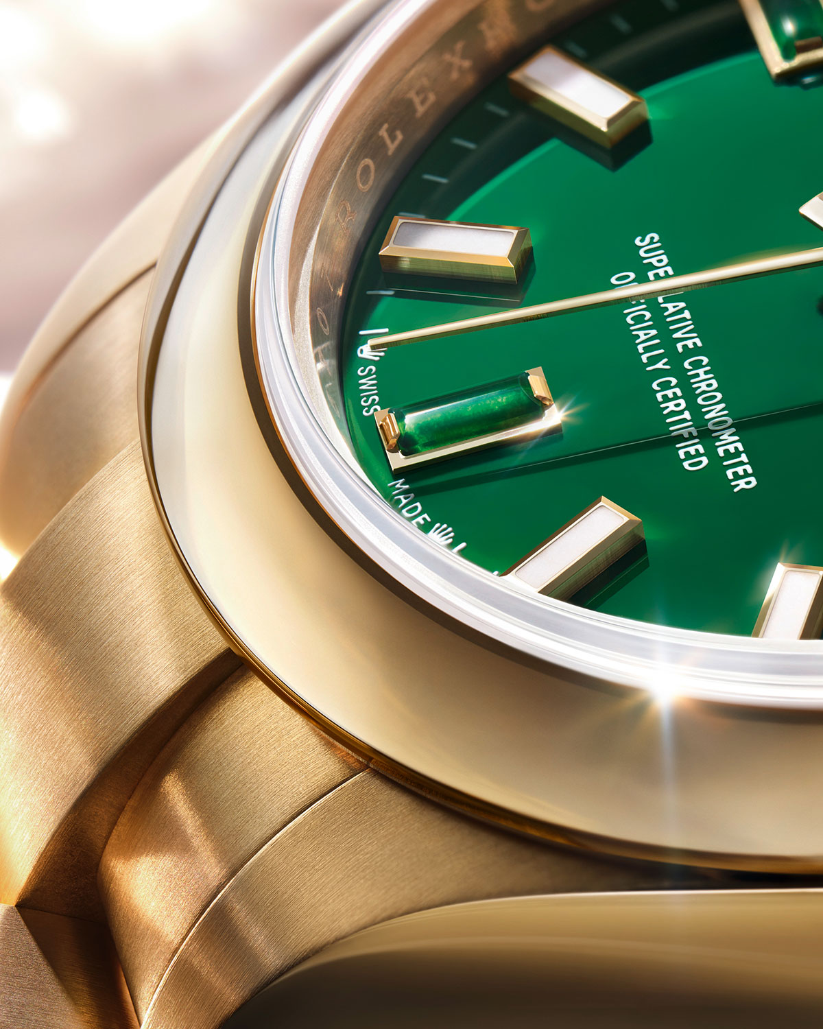 Là mẫu đồng hồ danh giá nhất của Rolex, Day-Date chỉ được chế tác từ kim loại quý từ khi ra mắt năm 1956 đến nay – vàng 18ct hoặc bạch kim. Lần này, chất liệu vàng Jubilee Gold 18ct hoàn toàn mới của Rolex tỏa sáng với các sắc thái vàng nhẹ, xám dịu và hồng mềm mại. Hợp kim hoàn toàn mới này, được phát triển và sản xuất nội bộ, minh họa khả năng đổi mới và sự tinh thông kỹ thuật của Rolex trong lĩnh vực chế tác kim loại quý.