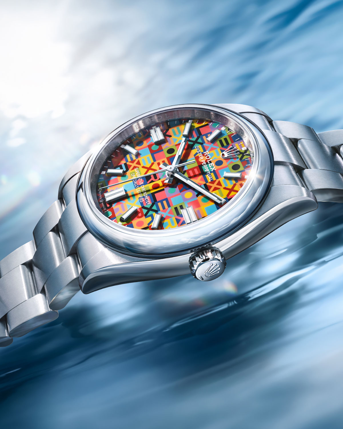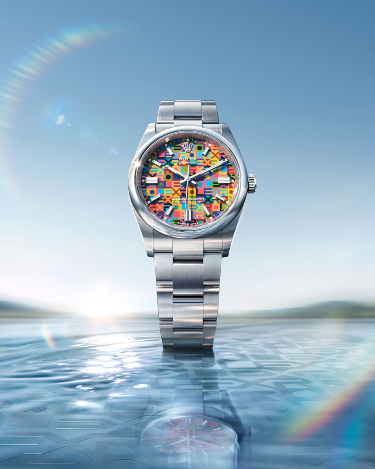 Một cách tinh tế nhưng hiện đại nhất, mặt đồng hồ của mẫu Oyster Perpetual 36 năm 2026 tái hiện lại họa tiết Jubilee được Rolex giới thiệu vào cuối thập niên 1970. Các mẫu tự trong tên Rolex phối mười màu tương phản vui mắt. Việc thực hiện mẫu họa tiết này đặt ra một thách thức đáng kể, vì các màu sắc không được tô cùng một lúc mà được tô lần lượt. Độ chính xác tối đa cũng là điều cần thiết để đảm bảo tất cả các hình khối và chữ cái tạo nên họa tiết được đặt đúng vị trí.