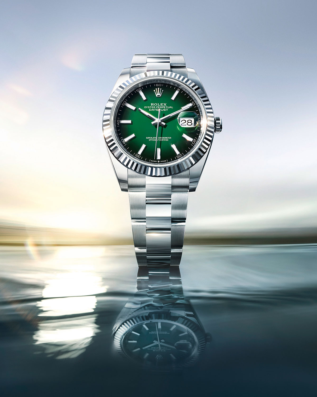 Mặt đồng hồ ở phiên bản mới của Datejust 41 được phủ sơn mài hoàn toàn – đây là lần đầu tiên một mặt số kiểu ombré được phủ lớp sơn mài kể từ khi thiết kế này được đưa vào danh mục sản phẩm của thương hiệu năm 2019. Lớp sơn mài màu xanh lá được phủ lên mặt nền, sau đó, giống như tất cả các mặt đồng hồ kiểu ombre, hiệu ứng ombre được tạo ra bằng cách phun sơn mài đen theo chuyển động đồng tâm.
