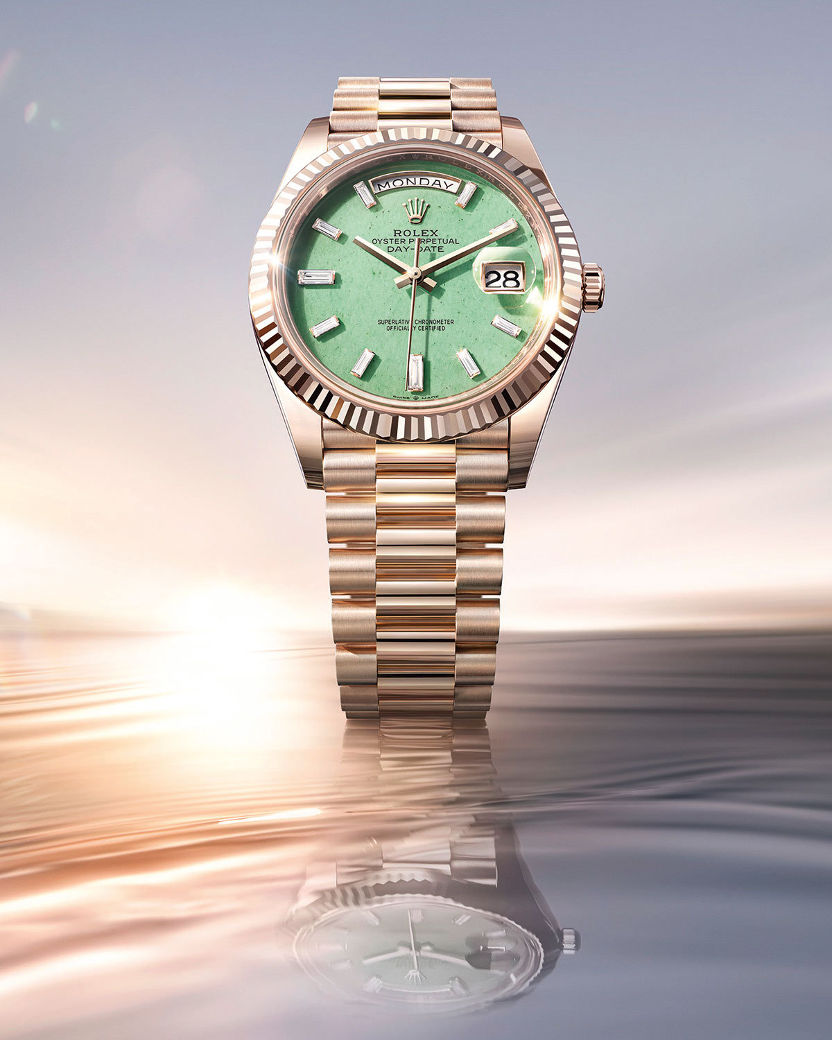Day-Date 40 bằng vàng Jubilee 18 ct với mặt số bằng đá aventurine màu xanh lục nhạt. Ảnh: Rolex