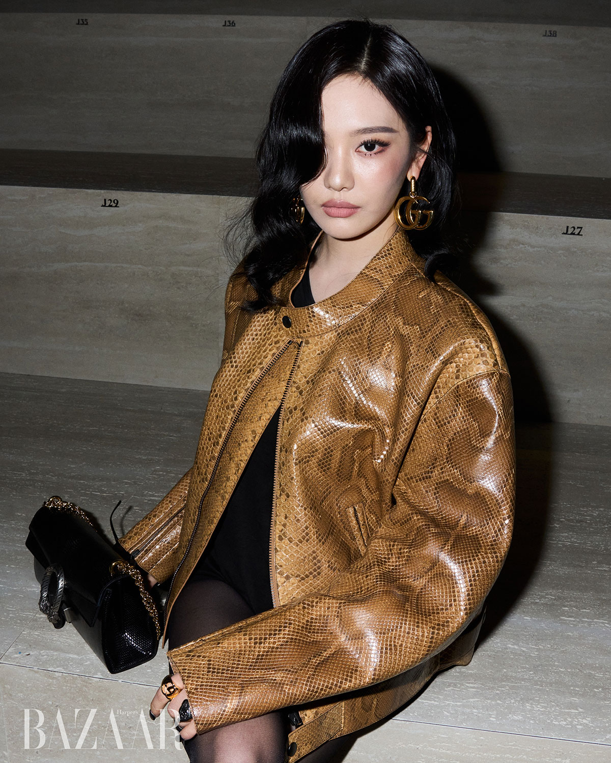 Để hoàn thiện diện mạo đậm chất maximalist, cô kết hợp cùng đôi bốt cao quá gối và đôi hoa tai mang biểu tượng hai chữ G lồng vào nhau ngoại cỡ. Sự kết hợp này tạo nên một tổng thể vừa nổi loạn, vừa giữ được sự sang trọng đặc trưng của nhà mốt Ý.