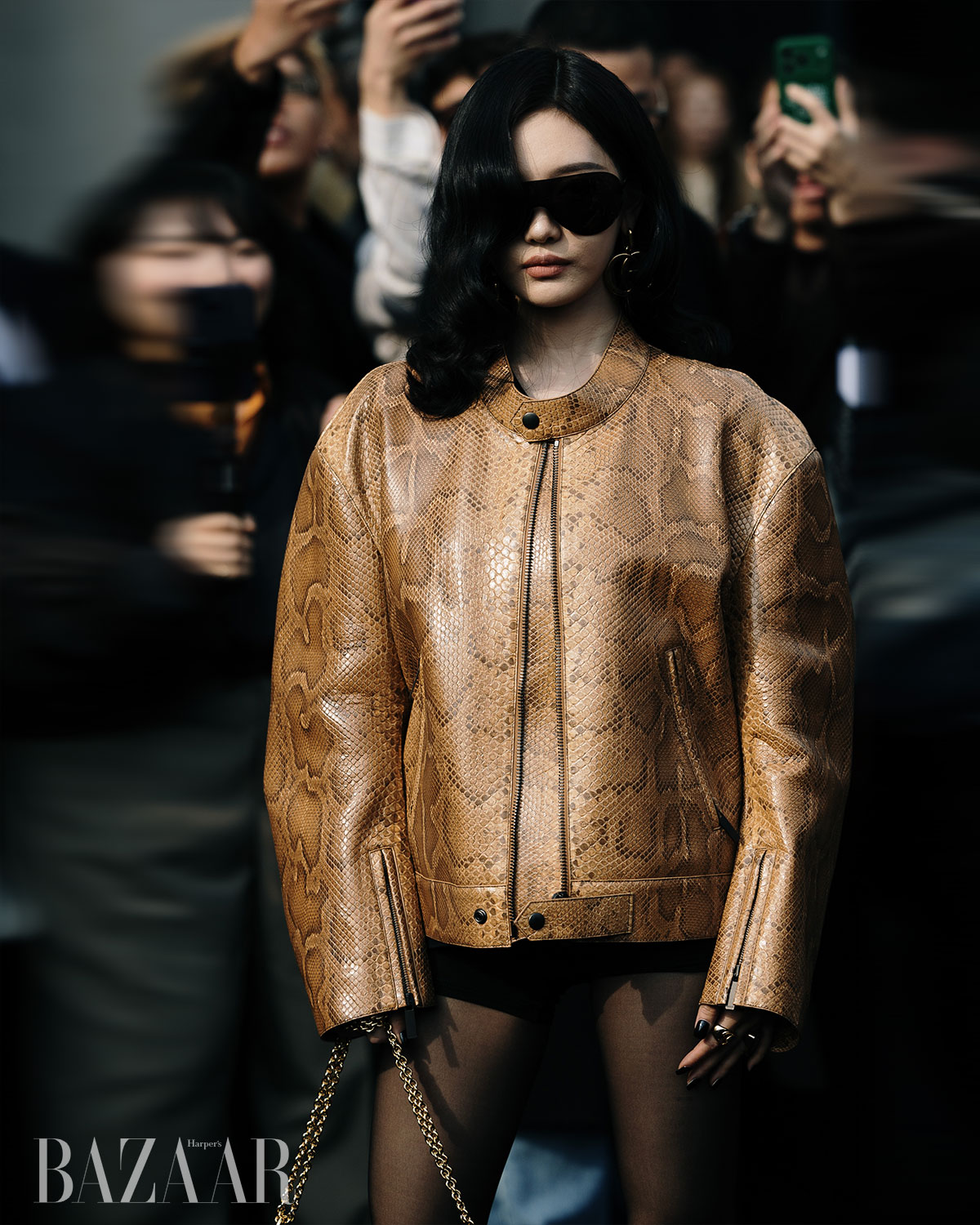 Song hành với chất cool ngầu của aespa, NingNing duy trì vẻ bốc lửa cố hữu của mình thông qua mốt giấu quần (pantless), khi cô mặc chiếc áo khoác dập họa tiết da rắn bên ngoài bodysuit đen và quần vớ xuyên thấu.