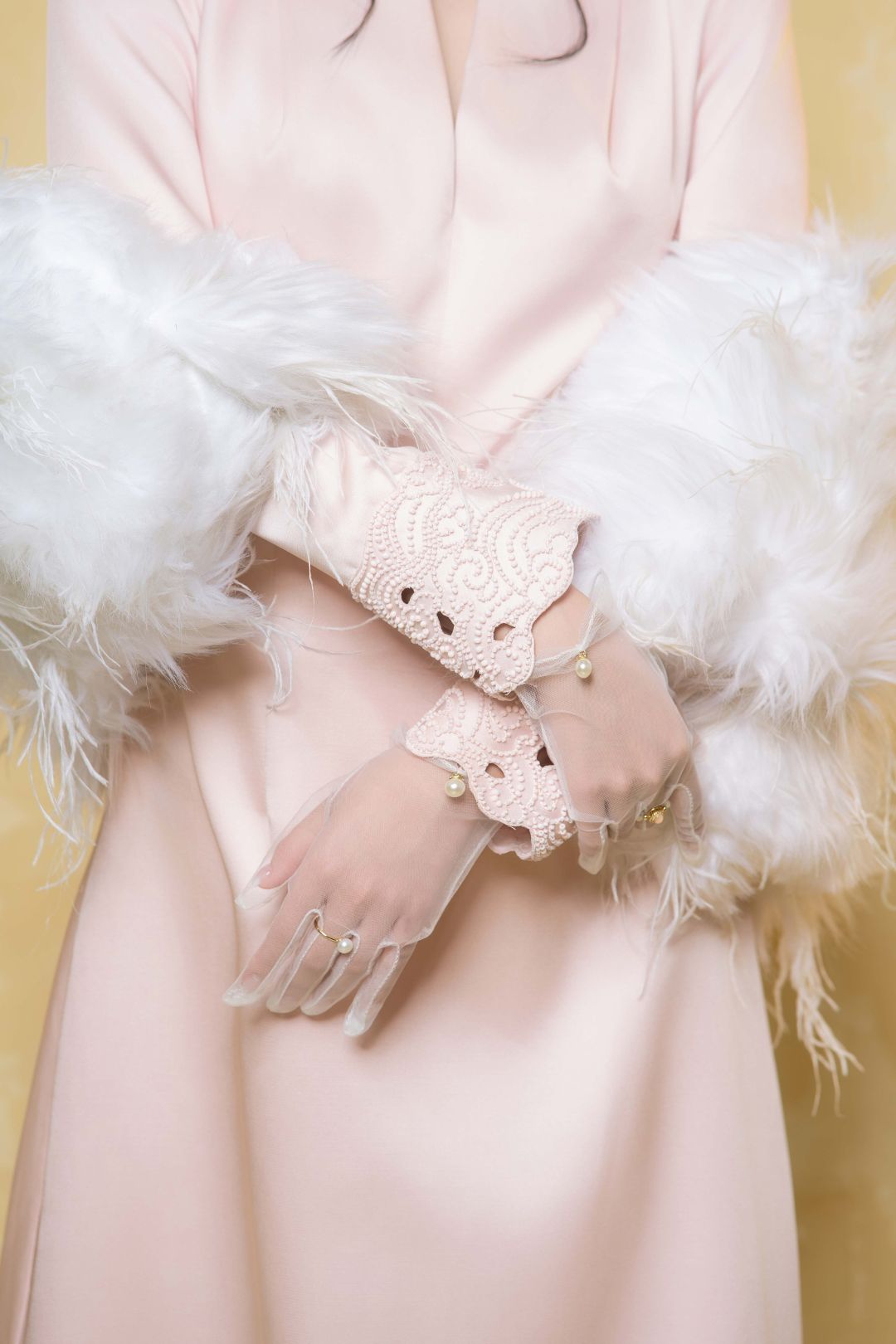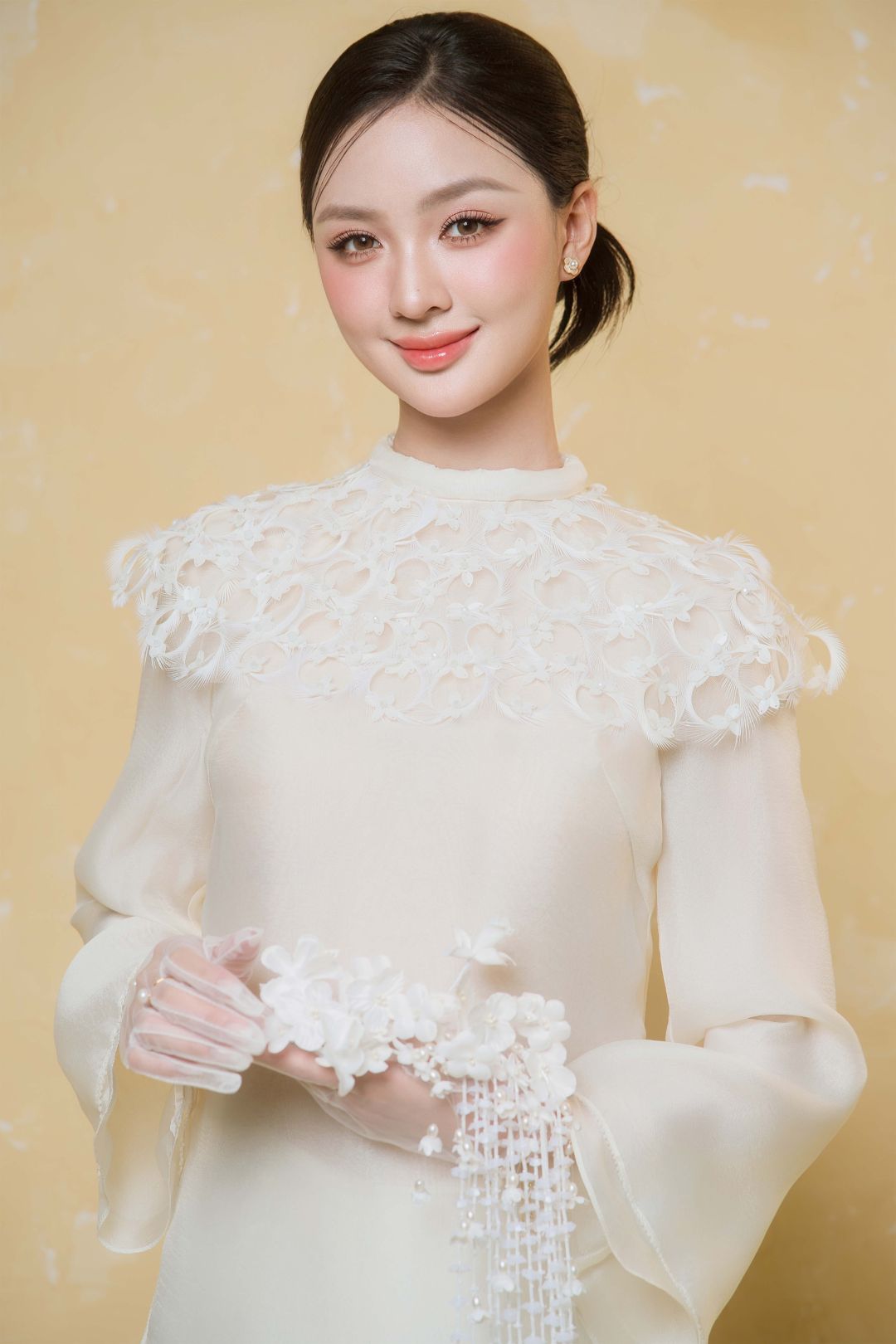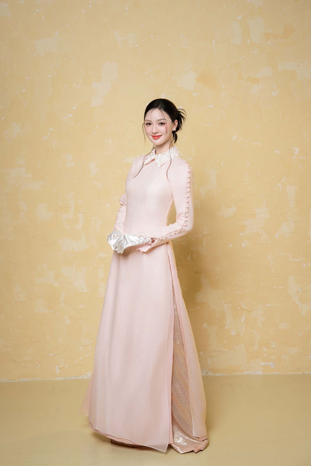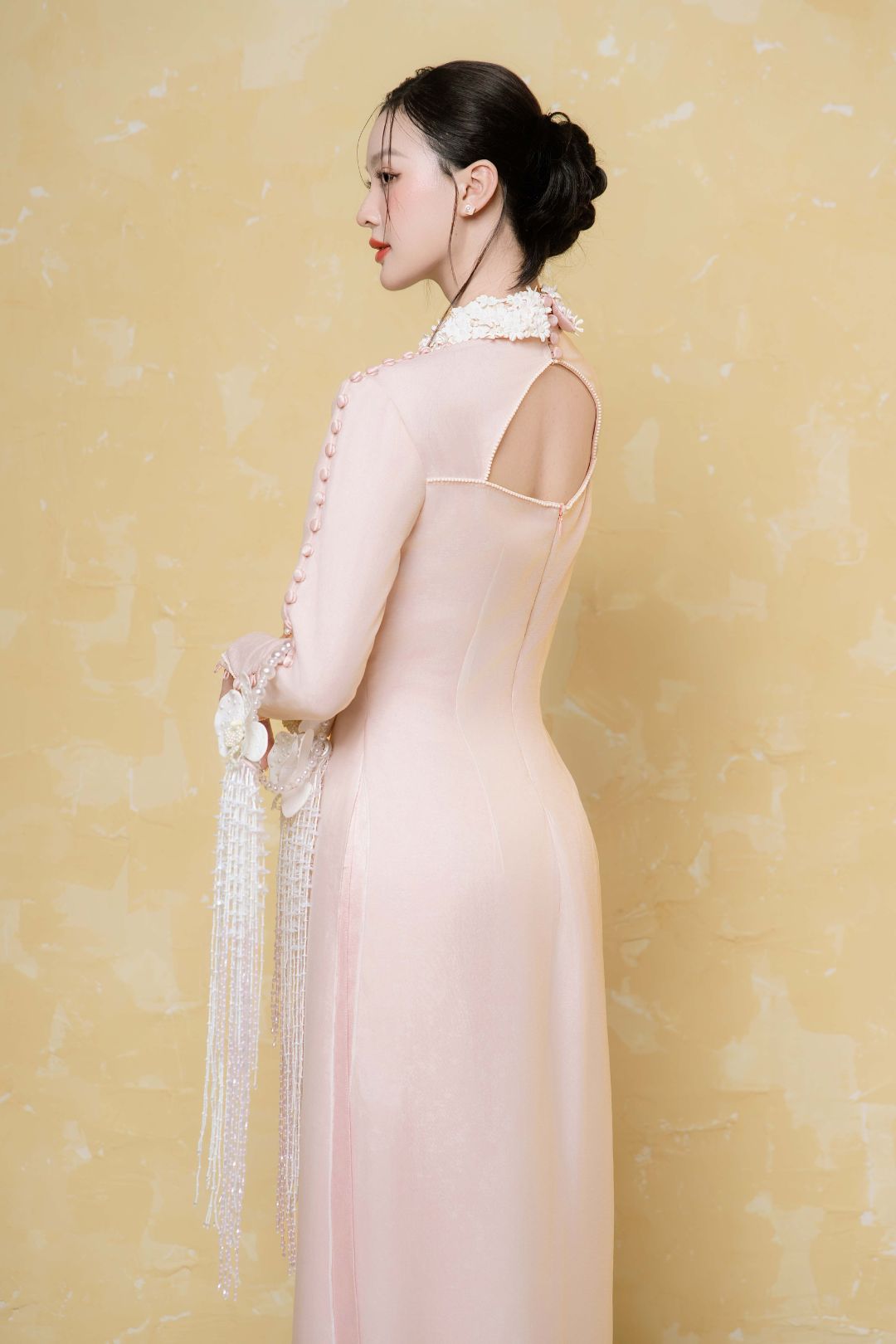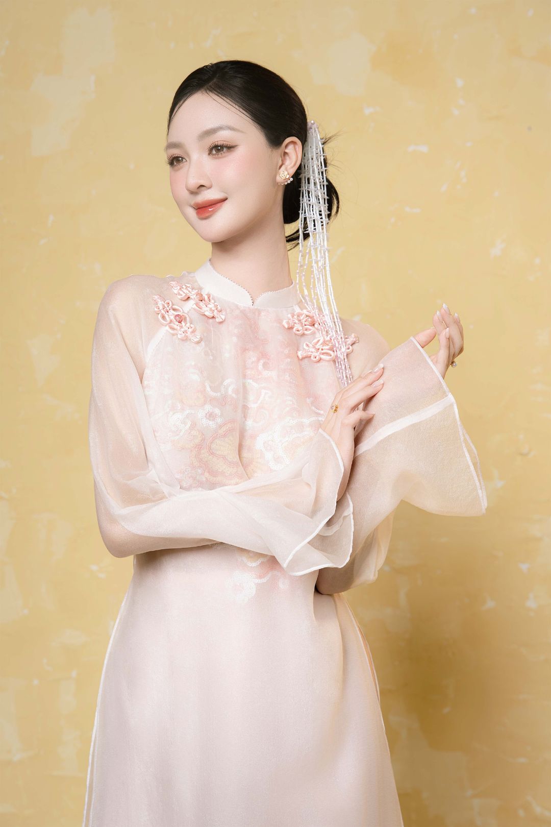 Bảng màu của bộ sưu tập áo dài Tết 2026 từ Đỗ Long cũng mang đậm tính biểu tượng. Trắng ngà và Hồng phấn gợi mở hình ảnh những áng mây trôi lững lờ giữa bầu trời, được nhấn nhá bằng kỹ thuật thêu tay và đính nhũ nhẹ tạo chiều sâu thị giác.