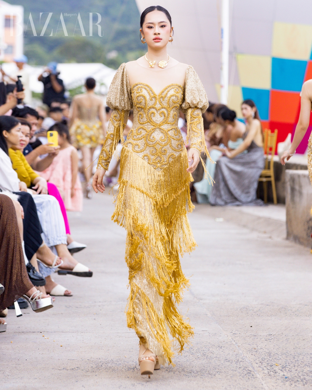 NTK Bá Phúc chọn gửi gắm vẻ đẹp của ánh sáng trên đại dương qua BST Tinh Quang Hải Lưu, với gam vàng gold, nude, trắng và phom dáng mềm mại gợi khoảnh khắc mặt trời chạm biển, đồng thời BST cũng là một sự tri ân tinh tế đến tà áo dài và văn hóa Việt.