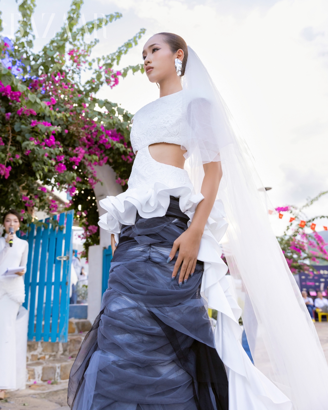 Chất liệu cũng đóng vai trò quan trọng trong việc truyền tải thông điệp. Satin, organza, voan xốp, taffeta… qua bàn tay khéo léo của NTK được xử lý bằng kỹ thuật 3D và những nếp gấp bồng bềnh. Những lớp vải ấy vừa uyển chuyển, vừa dày dặn cảm xúc, tạo nên hiệu ứng thị giác cuốn hút, khiến người xem như lạc bước trong miền ký ức được tái sinh bằng ngôn ngữ thời trang.