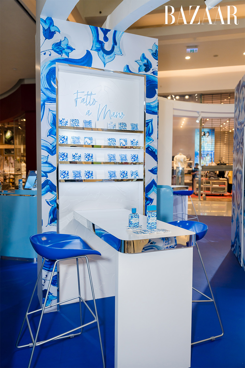 Không gian được trang trí với châm ngôn Fatto A Mano (dịch nghĩa là “thủ công” trong tiếng Việt) với họa tiết gạch men Majolica đặc trưng. Hoạt tiết gạch men Majolica màu xanh lam mát mắt trên men trắng thường thấy trong nghệ thuật trang trí và kiến trúc của vùng đảo Capri. Đây cũng là họa tiết mang tính nhận diện trong các thiết kế thời trang của Dolce & Gabbana và cũng xuất hiện trên mẫu chai Capri in Love được ra mắt lần này.