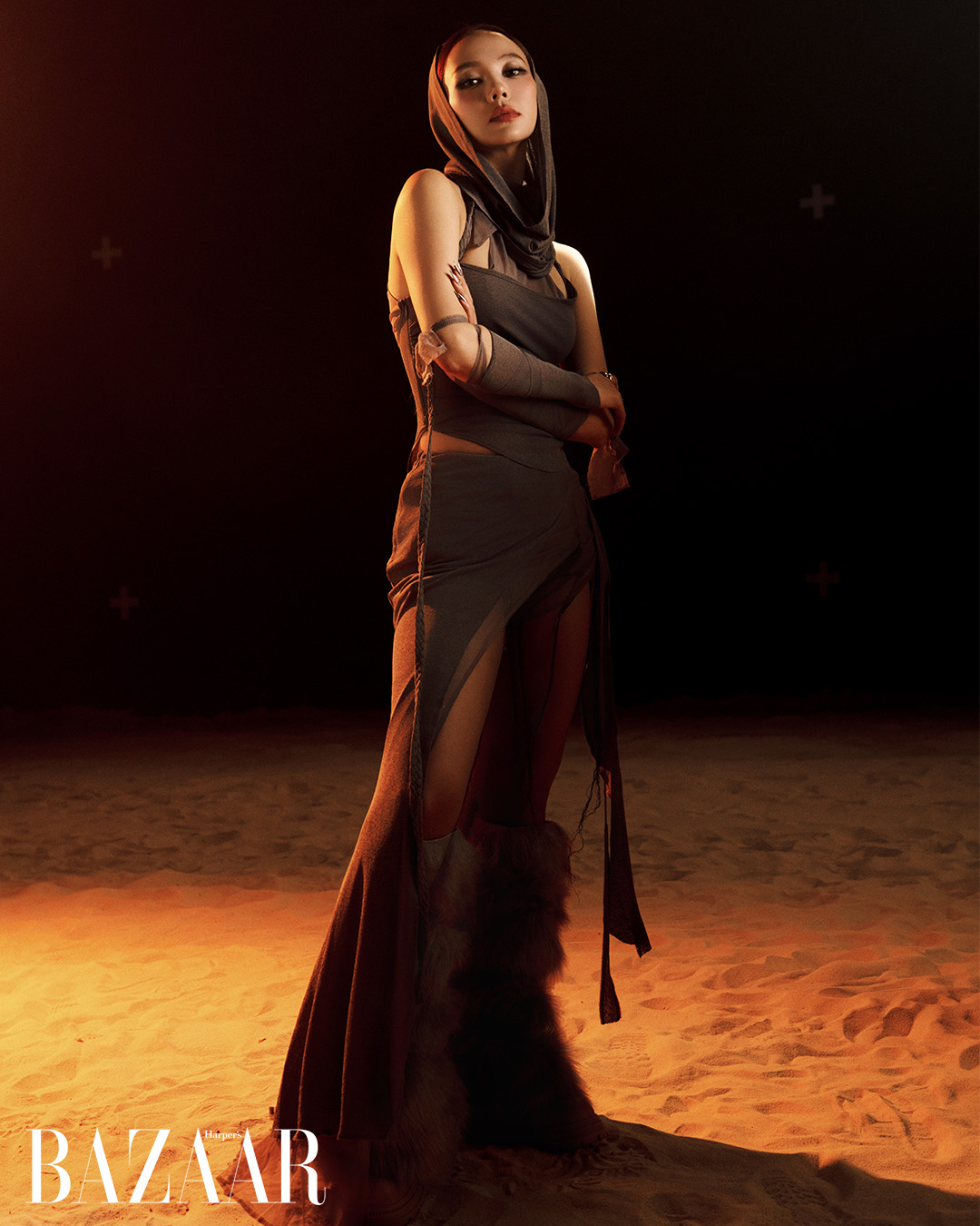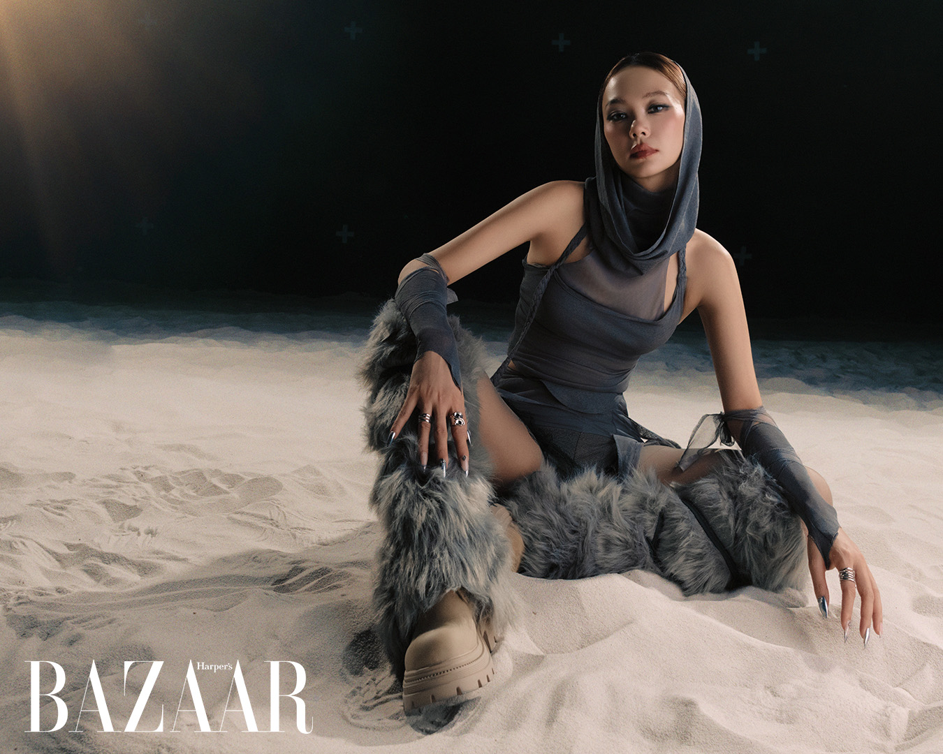 Ở phần trình diễn vũ đạo, Minh Hằng diện trang phục lấy cảm hứng từ phim Dune với tông màu cát và chất liệu thô mộc mang đến hình ảnh một “chiến binh sa mạc” kiêu hãnh, thể hiện bản năng và quyền lực nữ giới trong thế giới viễn tưởng.